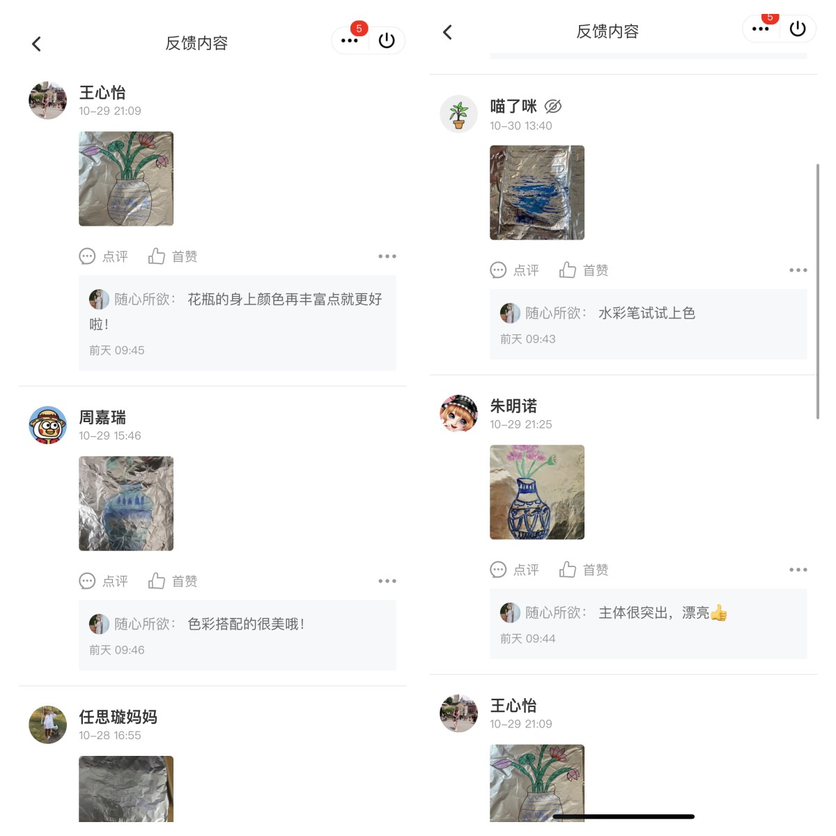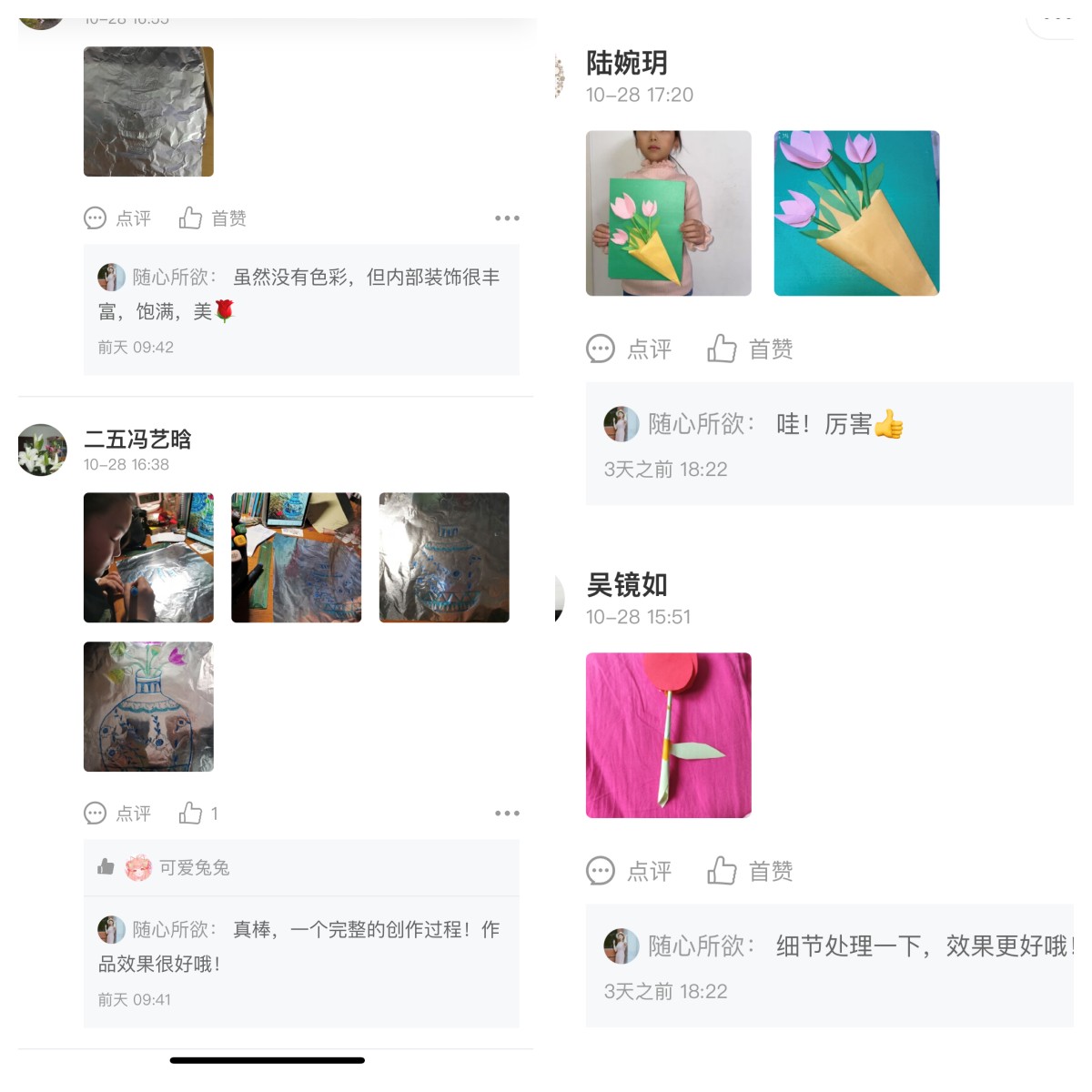 线上教学,虽隔着屏幕,但师生的心是连着的,情是相通的。虽不能相见,但老师们始终记挂着孩子们,他们充分挖掘每个学生作品里的闪光点,积极引导他们在美的氛国中,陶冶出美丽的心灵,同时见证孩子们每一天的努力与进步。