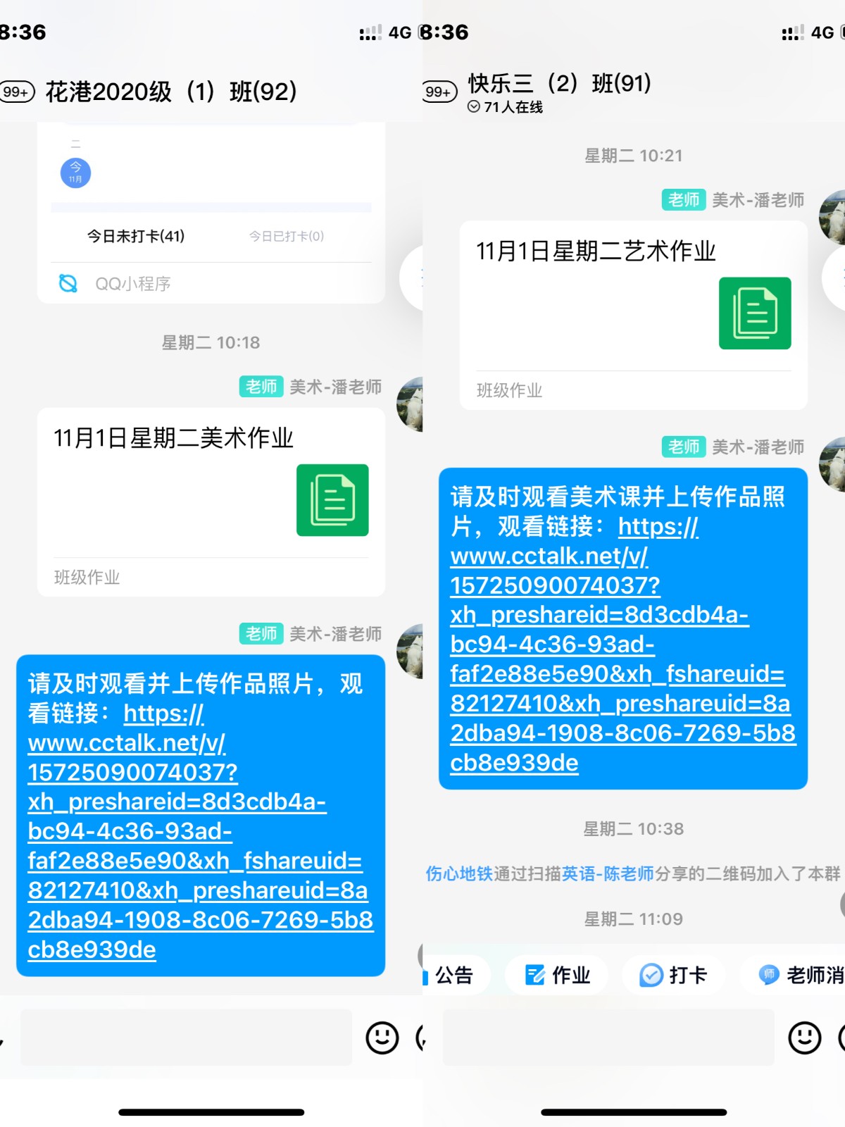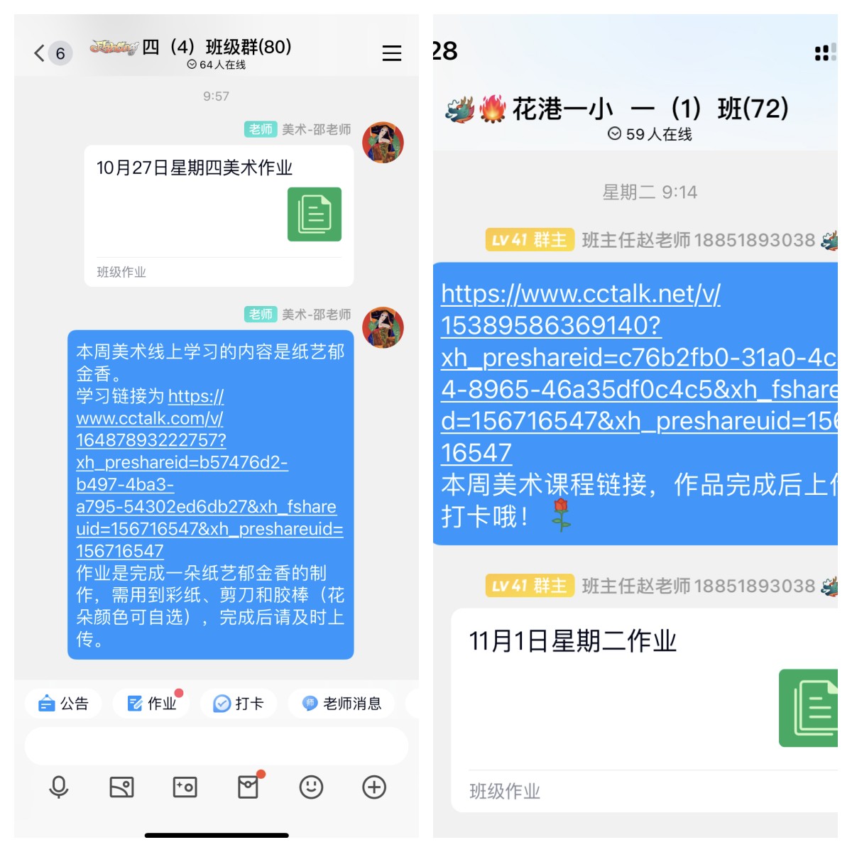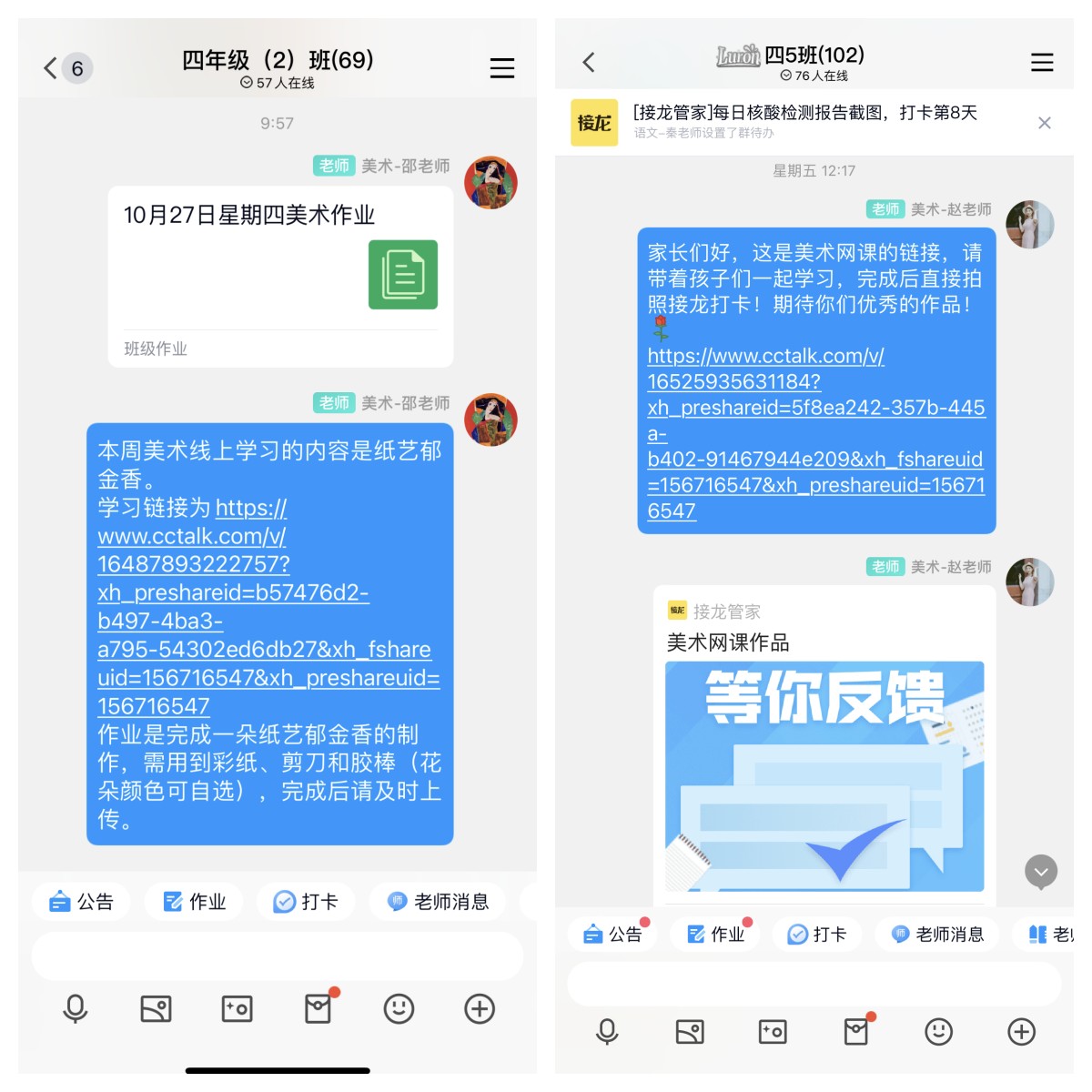 看!老师们都提前在群里发布通知,叮嘱孩子们上课的注意事项呢,提醒准备工具材料。