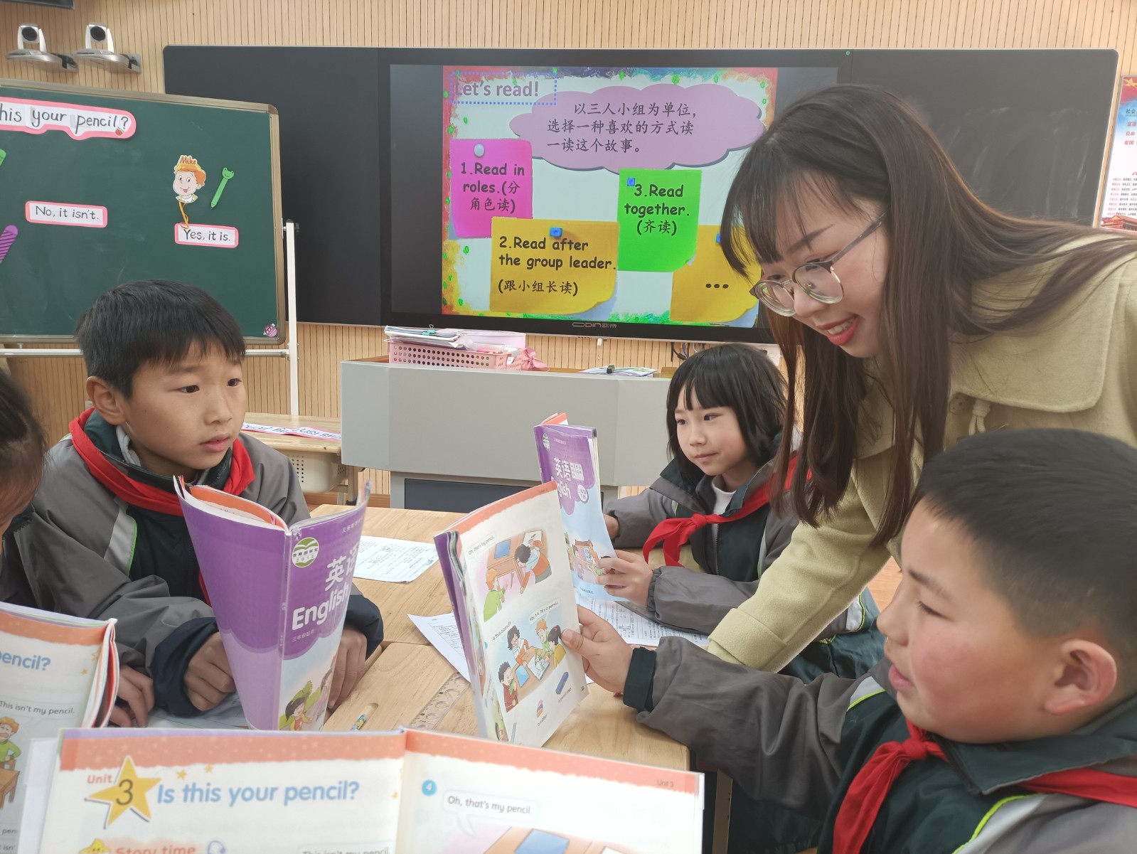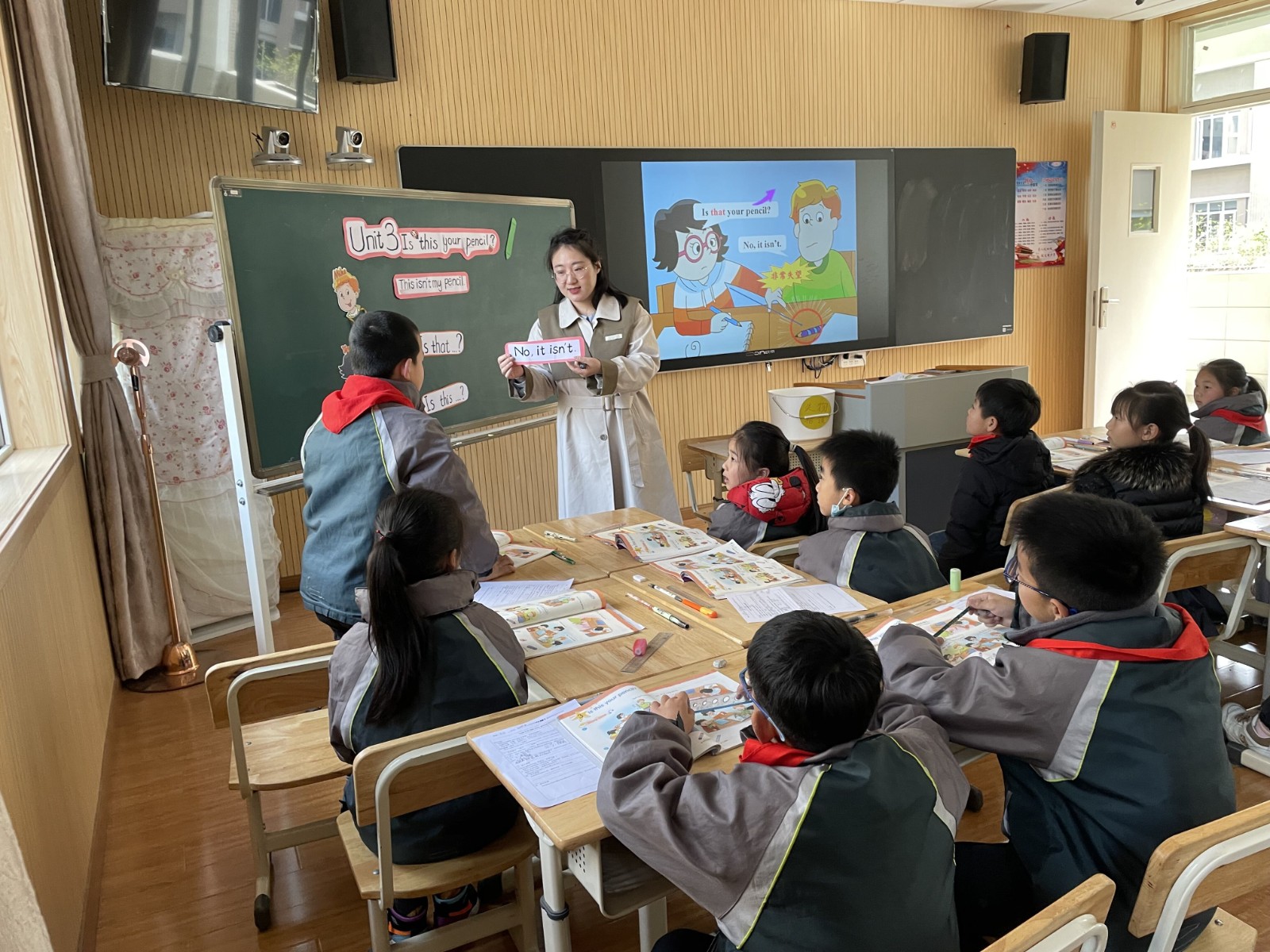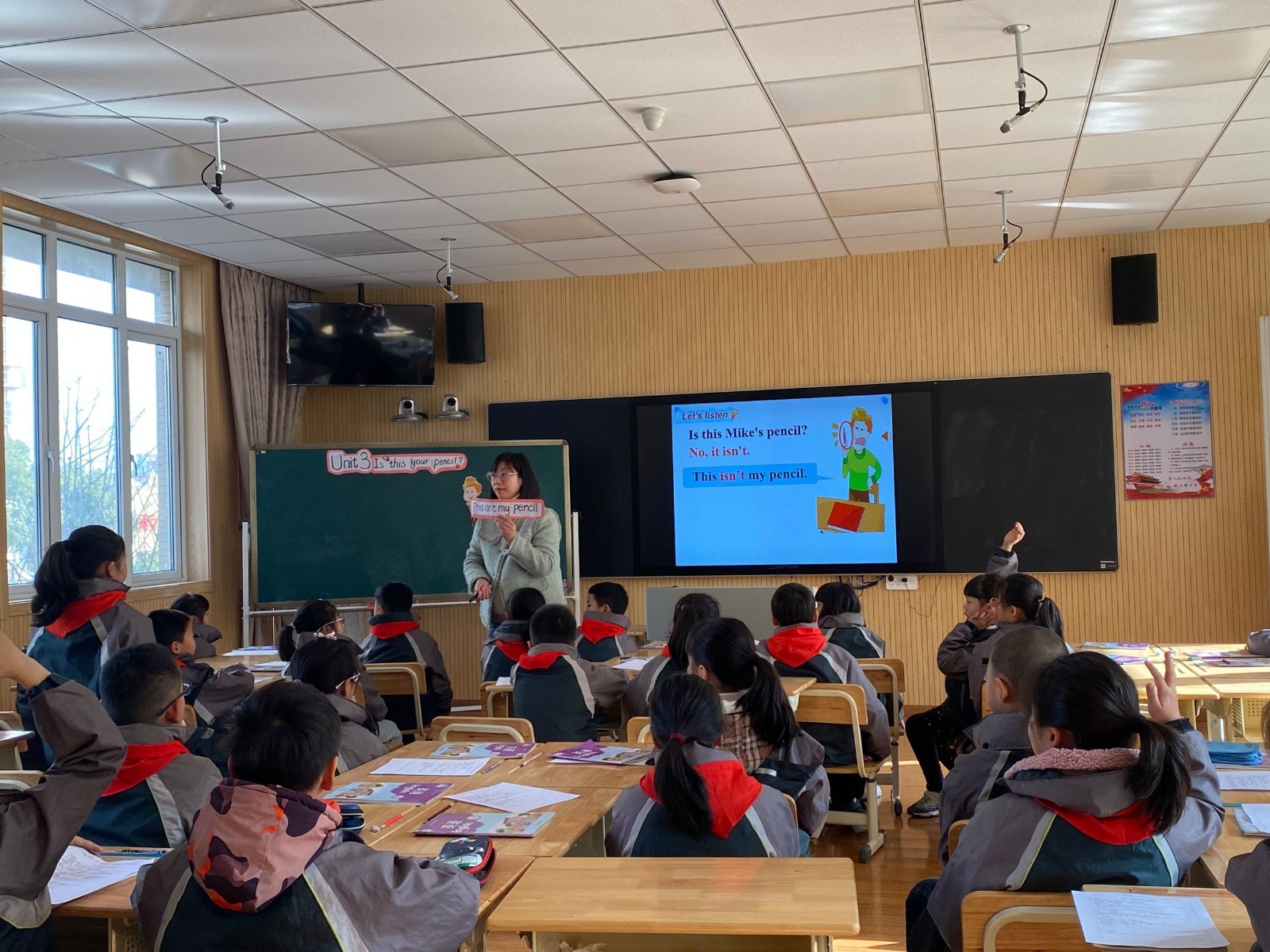 周二上午,毛毛老师同样也执教了《Unit3 Is this your pencil?》。在导入环节,毛老师结合第一二单元的指令语进行活动开场,让学生们进行积极的头脑风暴,说出更多类的文具单词。在教学过程中,她带领学生感受Is this/that...?疑问句的询问。在拓展环节,开展失物招活动,操练句型的同时也让学生感受到帮助他人的乐趣。