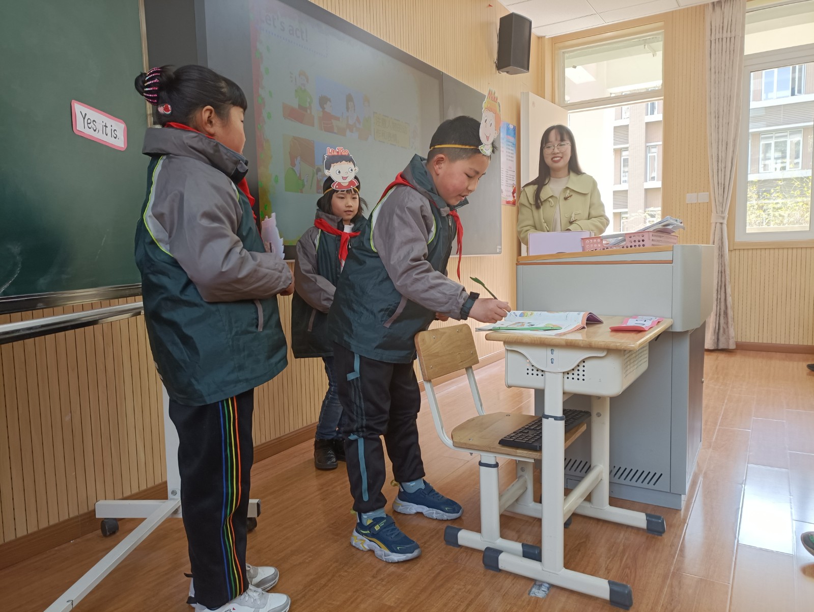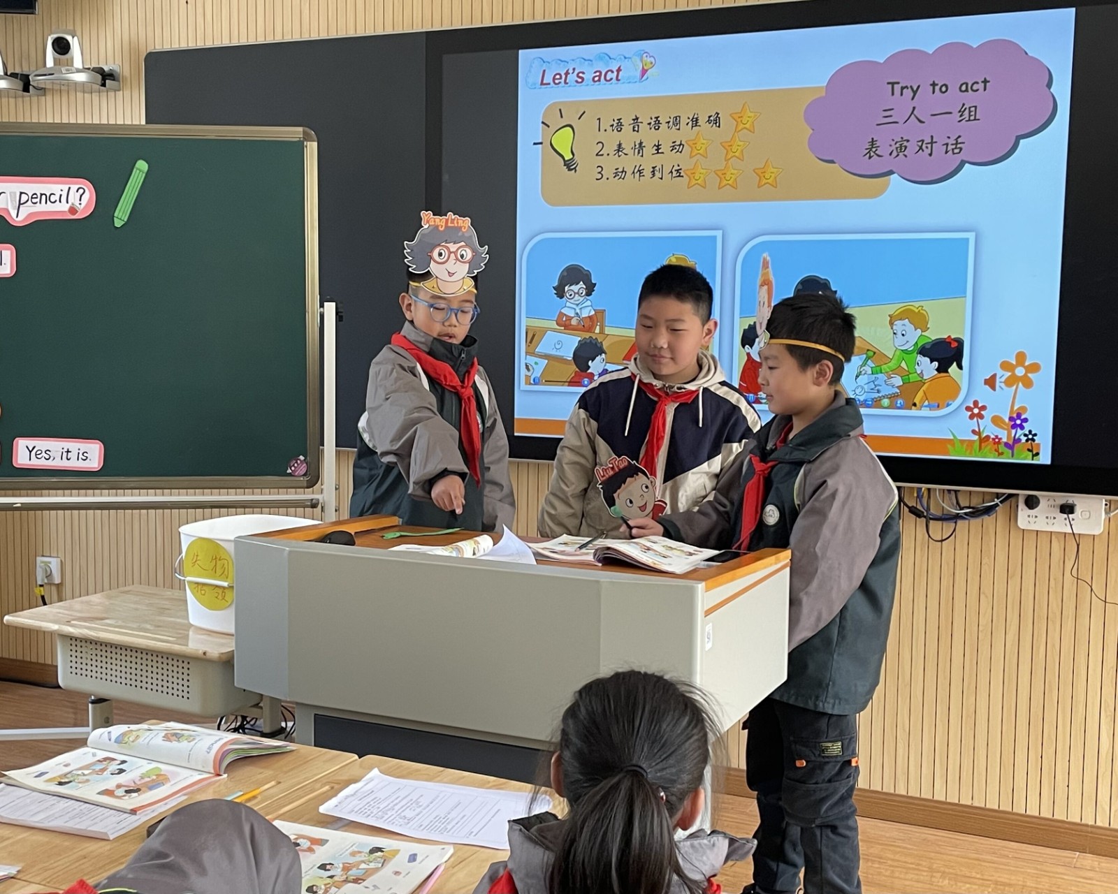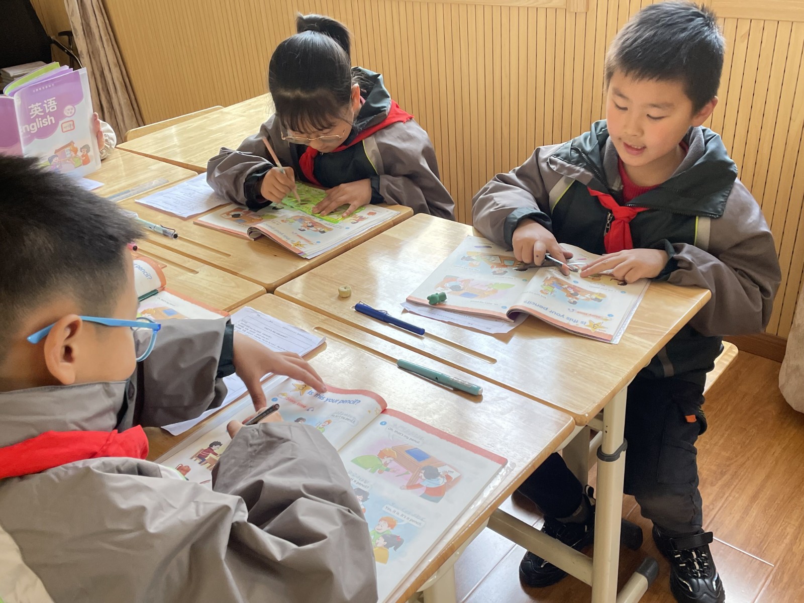 周一上午,陈可欣老师进行《Unit1 Is this your pencil?》第一课时试上,陈老师以歌曲导入本节课,接着用brain storm 的方式复习学习过的衣服类词汇,玩具类词汇,并教授Is this…?Is that…?接下来的课文阅读教学。陈老师注重语音语调,通过小组朗读,表演等方式熟练掌握课文,课堂气氛轻松活跃。
