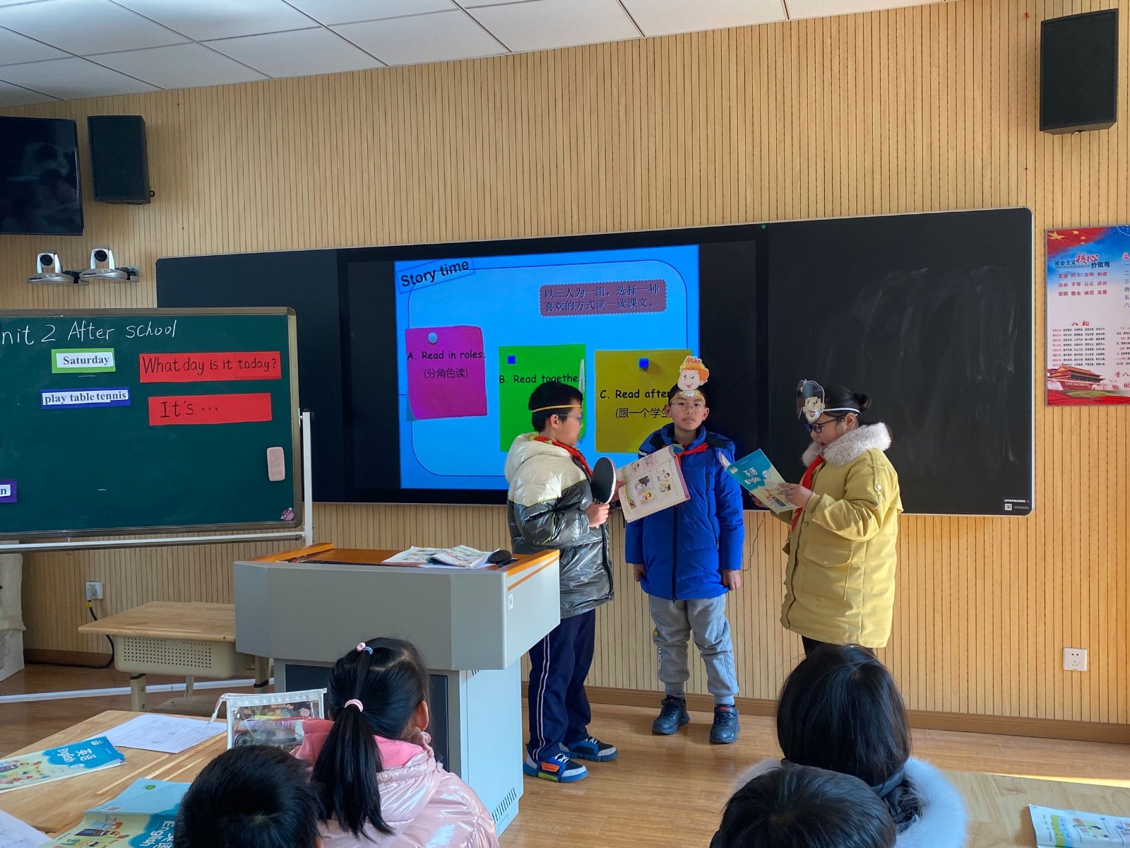 管筱老师执教《Unit2 After school》,课件精美,课堂氛围活泼。管老师先用《The days of the week》歌曲导入。以班级里一个学生的名义,发出新学期课程表“朋友圈”,通过其他同学点赞评论的方式展现Unit1的重点句型。形式新颖,巧妙地复习了第一单元已学的学科类知识点。接着,管老师用单词卡片带读生词,展示足球、乒乓球拍等实物穿插教学。然后以丰富多彩的音频、视频、动画形式教读课文句段,学生跟读模仿语音语调、分角色表演课文对话。最后结合学校丰富的社团活动,创设主题情境,让学生畅所欲言。