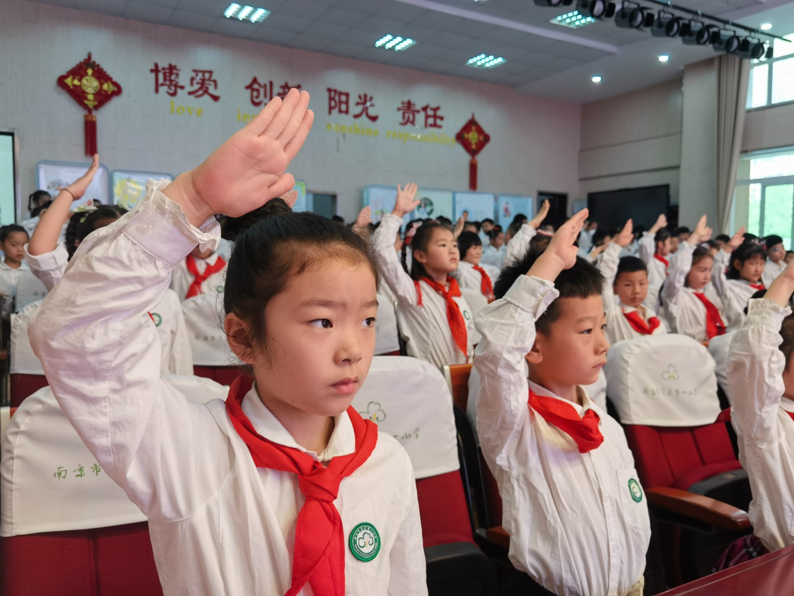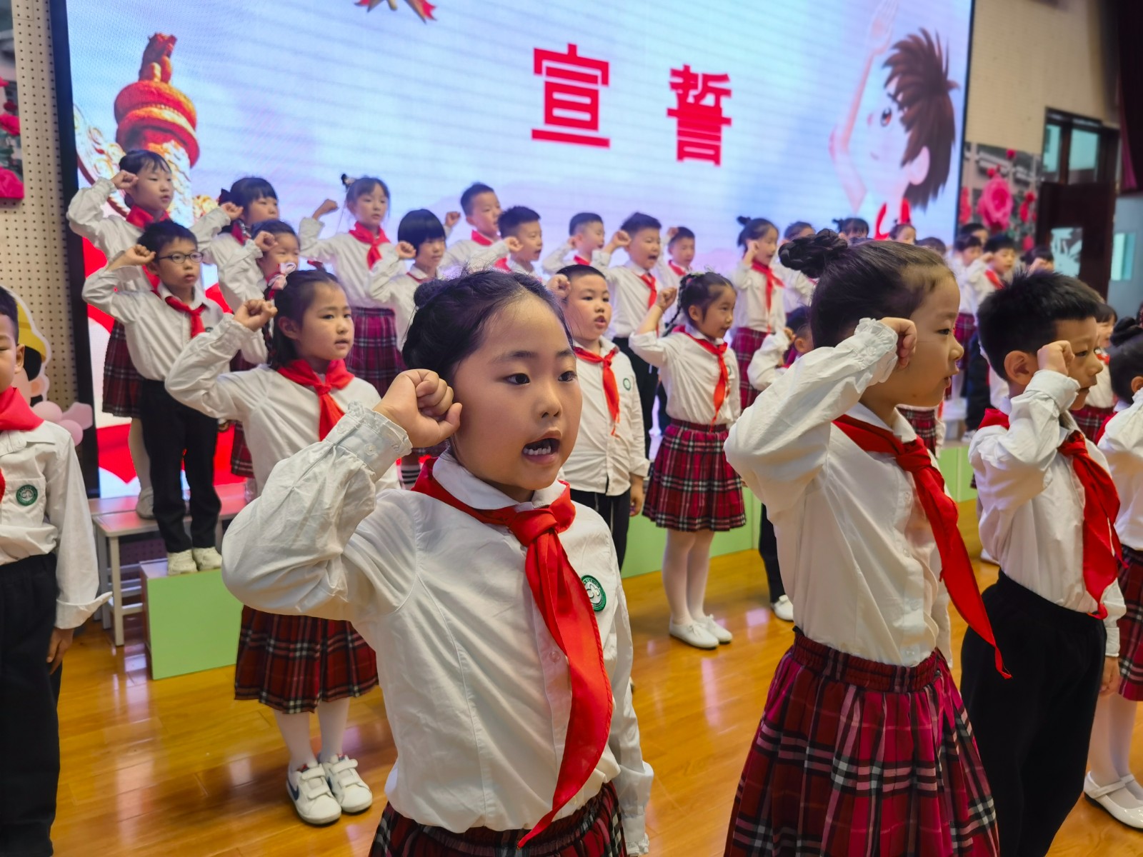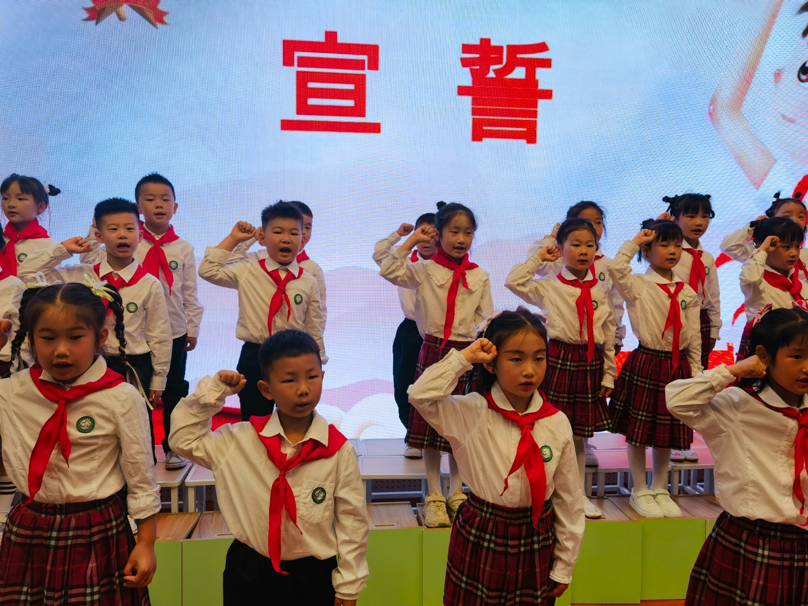 “我是中国少年先锋队队员……”在大队长孙昊天的带领下,新队员们高举右拳,庄严宣誓。神圣的誓言回荡在耳畔,坚定了少先队员们为共产主义事业奋斗的坚定信念。