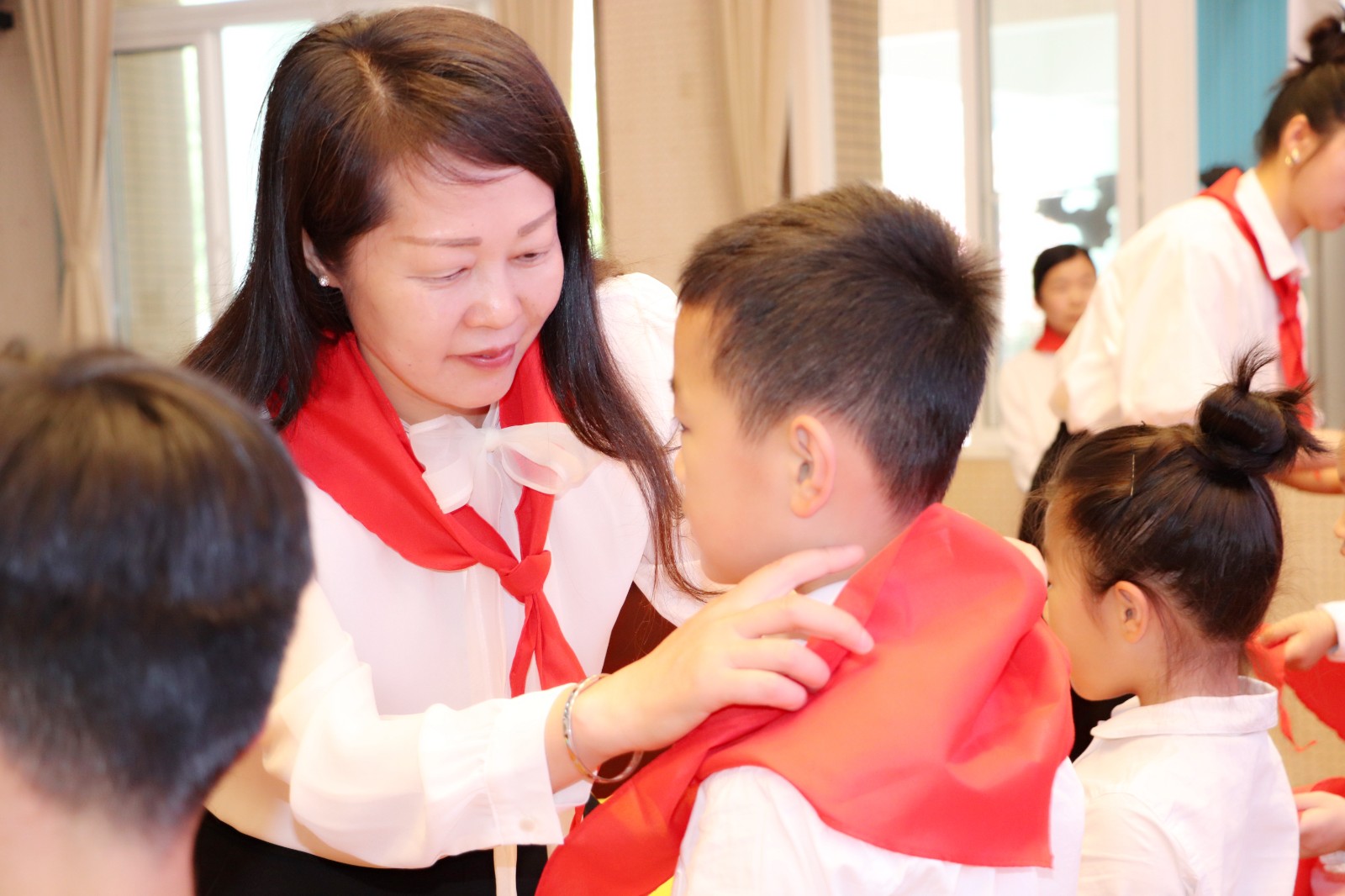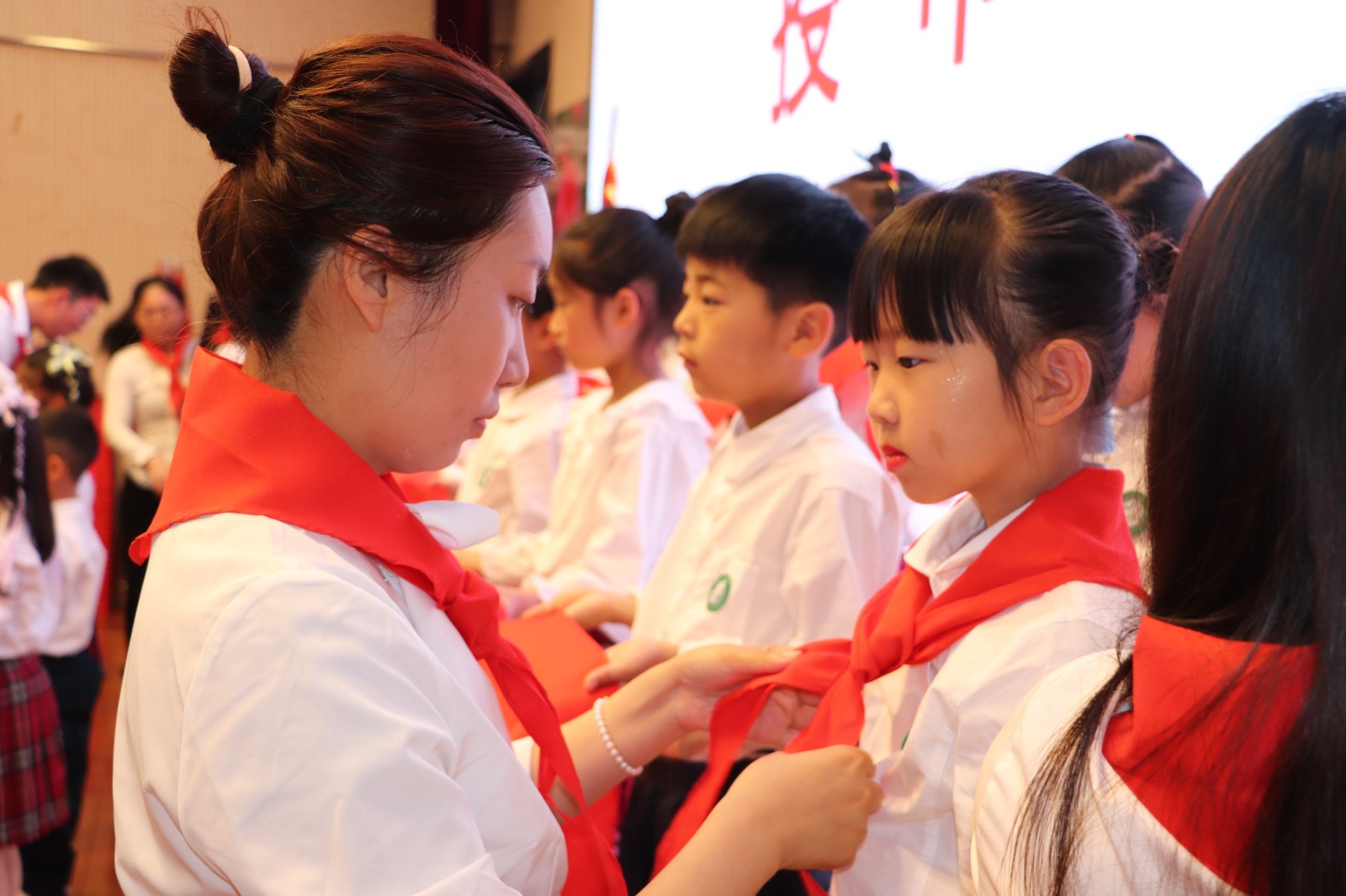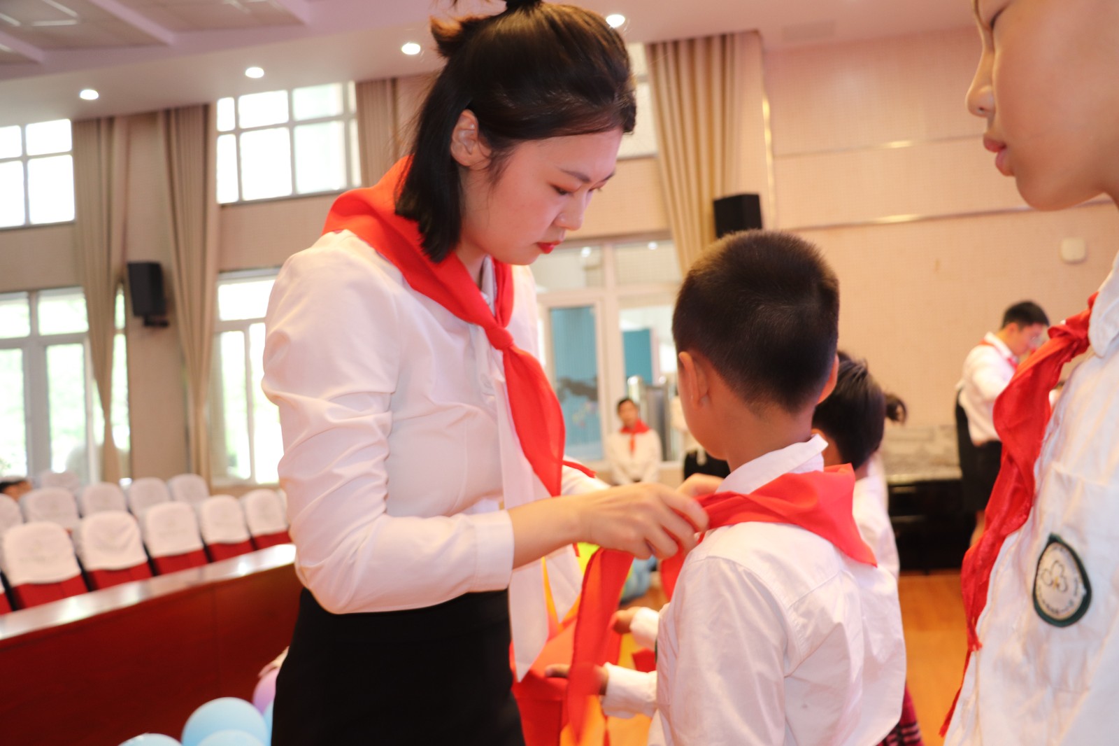 新队员们站姿挺拔,气宇轩昂,在他们兴奋又期盼的目光中,中队辅导为他们佩戴红领巾。看着红领巾在胸前飘扬,新队员们的脸上满是激动和自豪。每一条红领巾都是用鲜血染成,每一位少先队员都能沐浴到党的阳光。