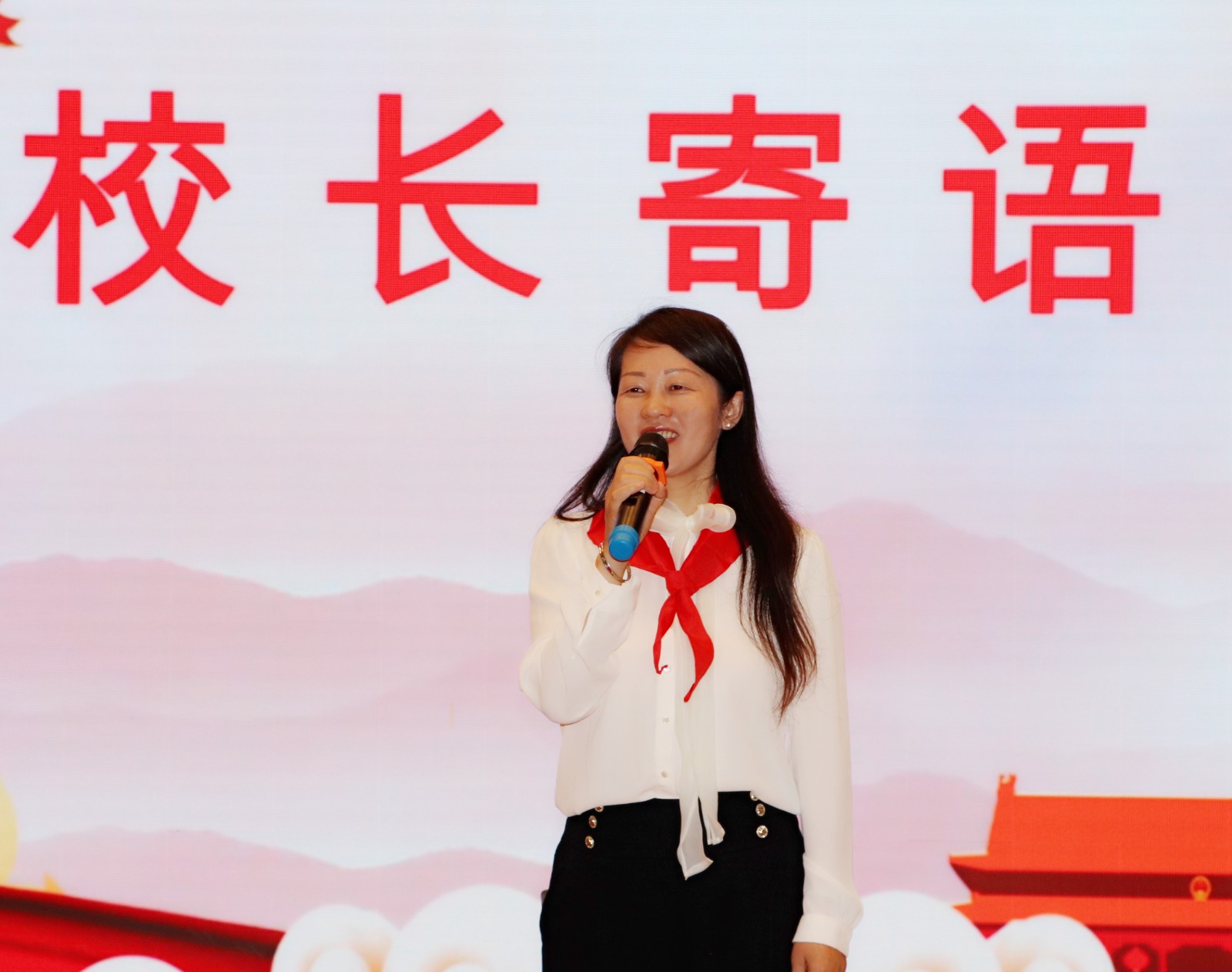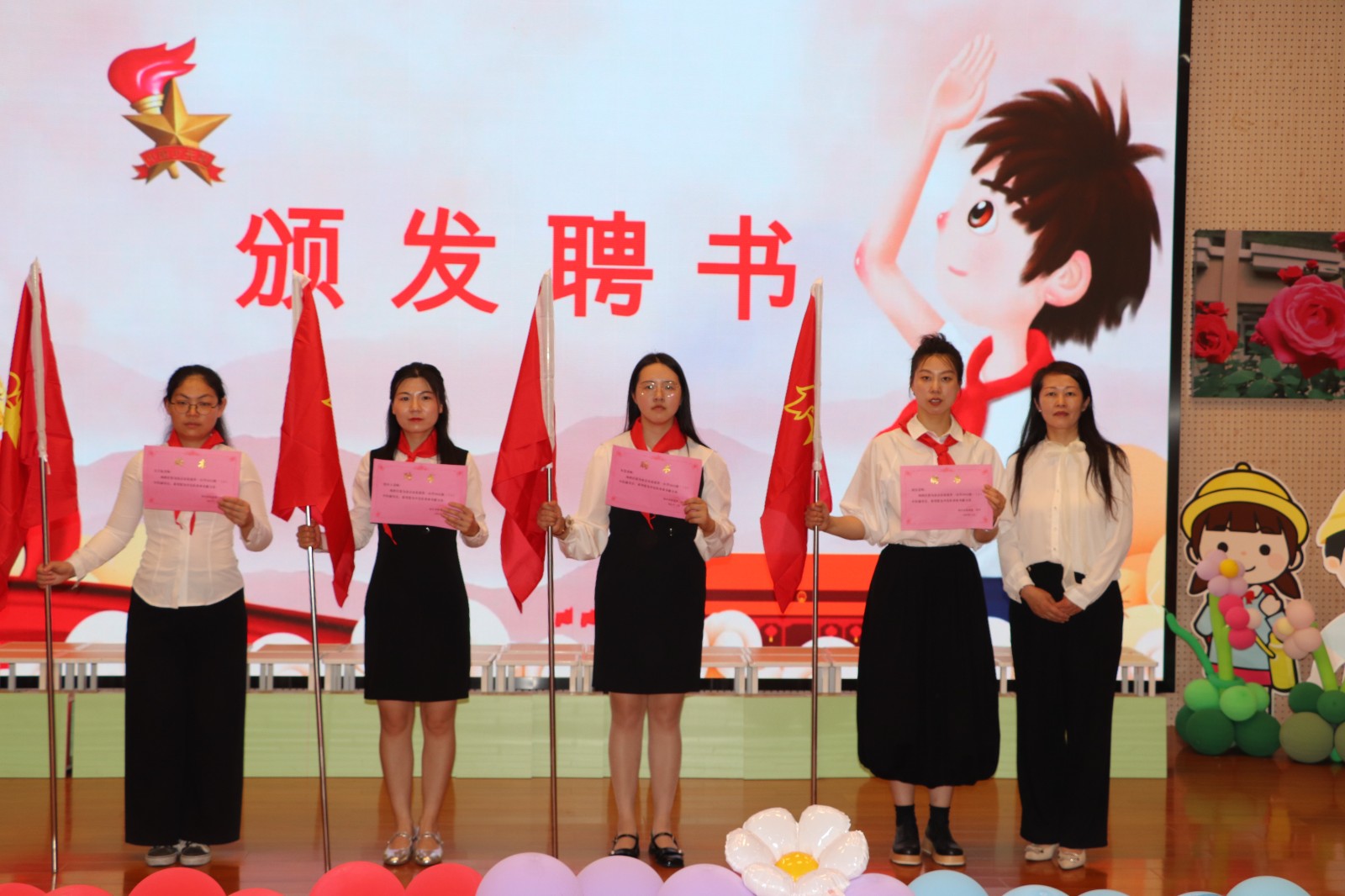 郭校长为新建中队的四位辅导员颁发聘书并寄语,相信他们一定会带领队员们共同努力,建设一支勤劳勇敢、自强不息的中队。