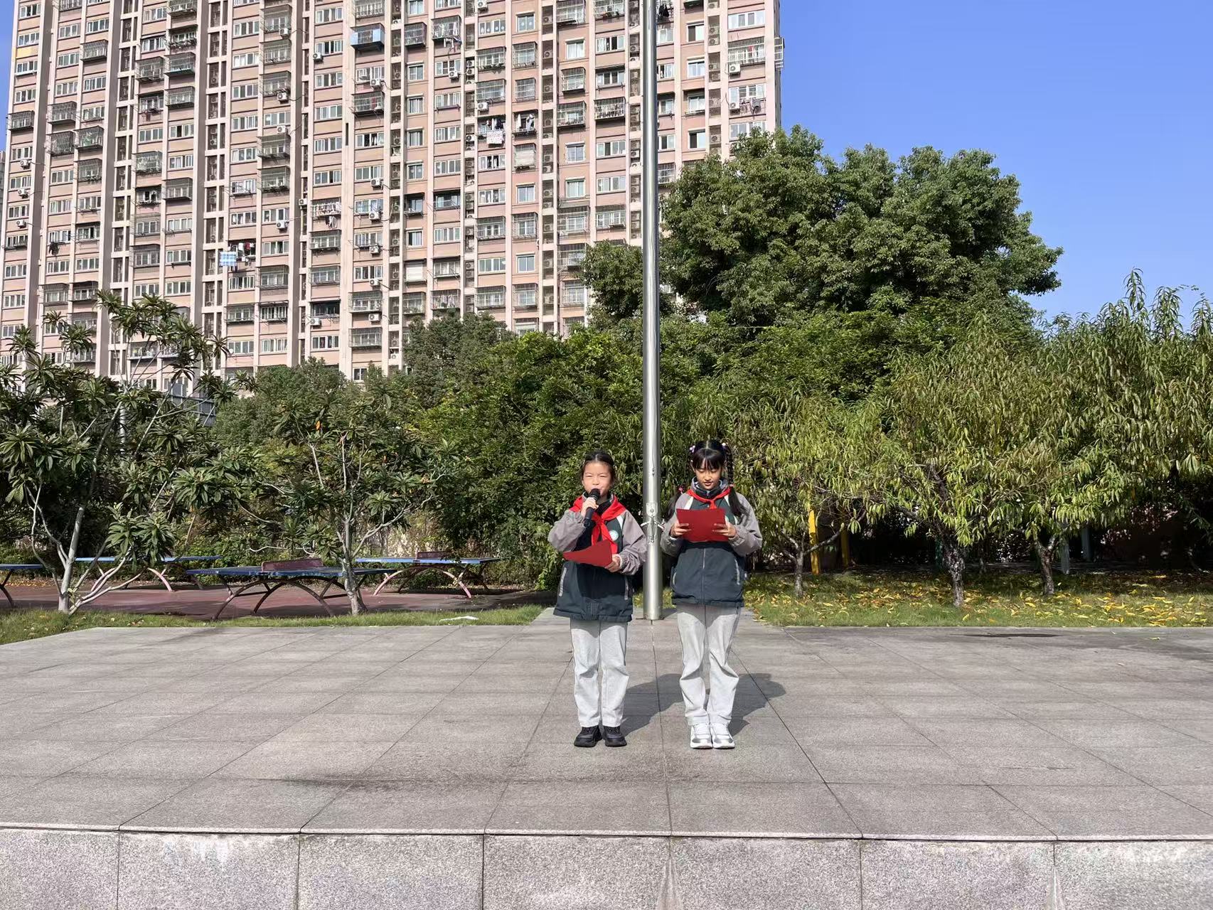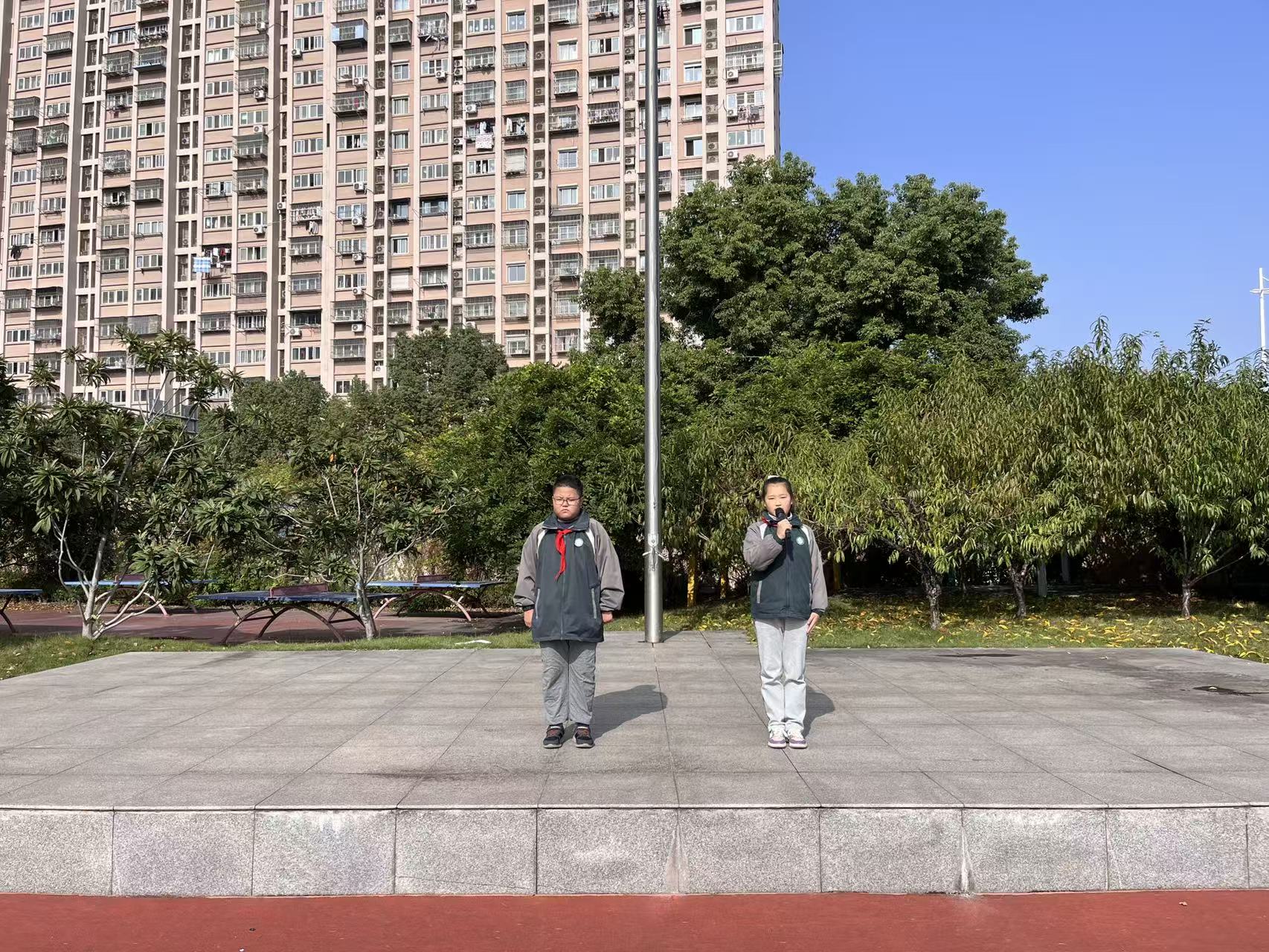 本次升旗仪式由四(2)中队主持,徐慕妍和杨楷怡担任主持人。简短的开场后,主持人介绍来自本中队的两位升旗手,王睿阳和裴诗晗。