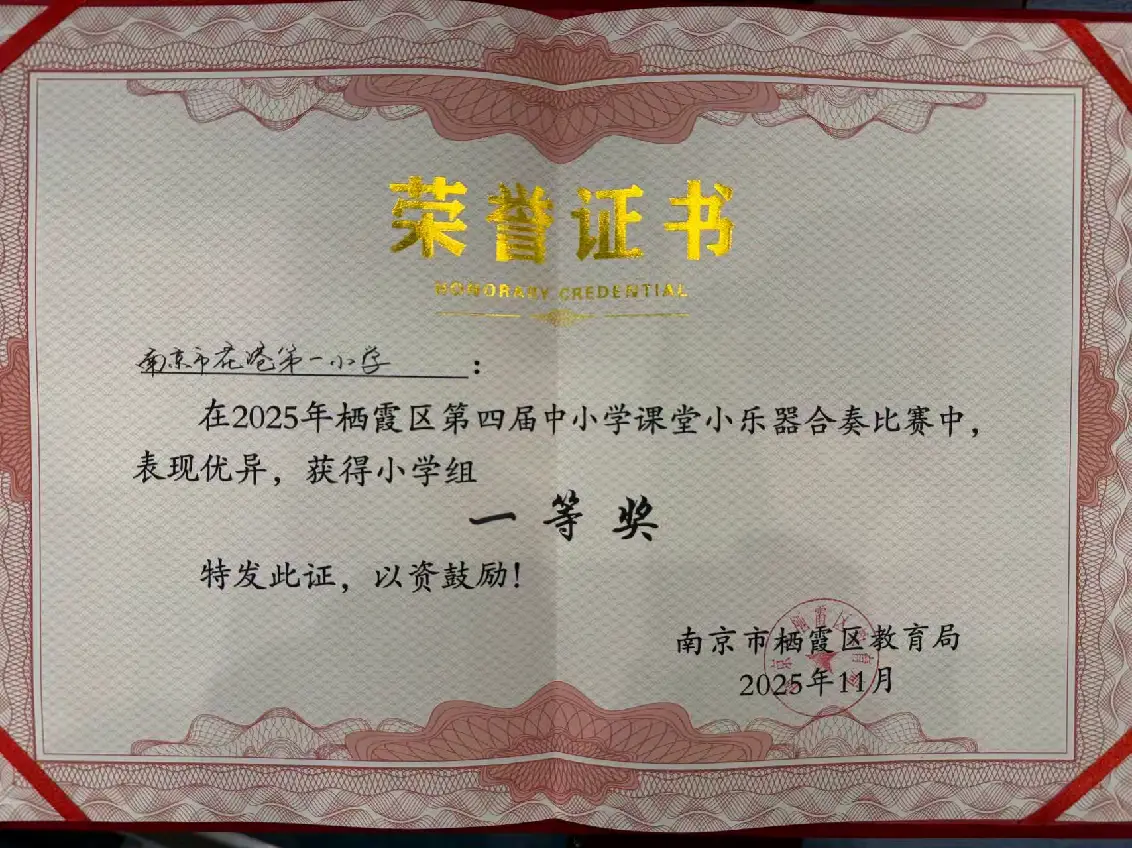 我校在2025年栖霞区第四届中小学课堂小乐器合奏比赛小学组中获一等奖。