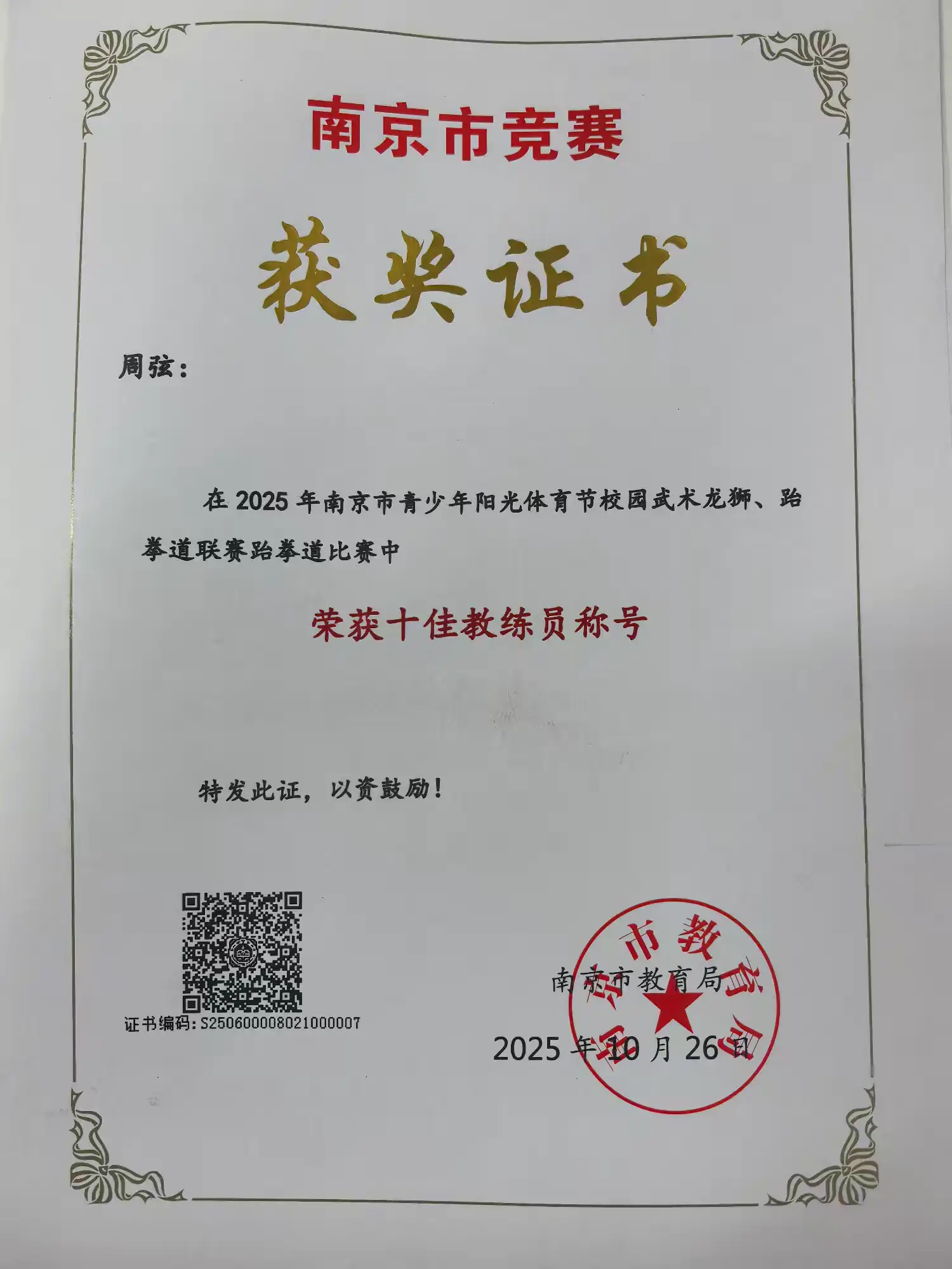 周弦老师在2025年南京市青少年阳光体育节校园武术龙狮、跆拳道联赛跆拳道比赛中获十佳教练员称号。