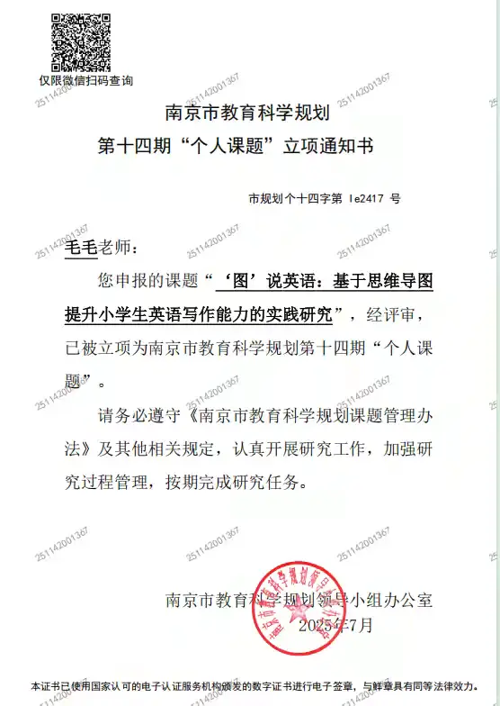 毛毛老师在南京市区教育科学第十四期个人课题立项。