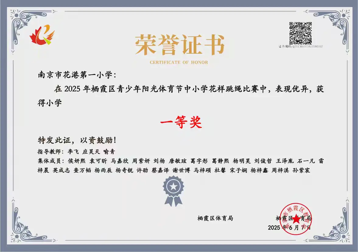 我校在2025年栖霞区青少年阳光体育节中小学花样跳绳比赛中获得小学组一等奖。