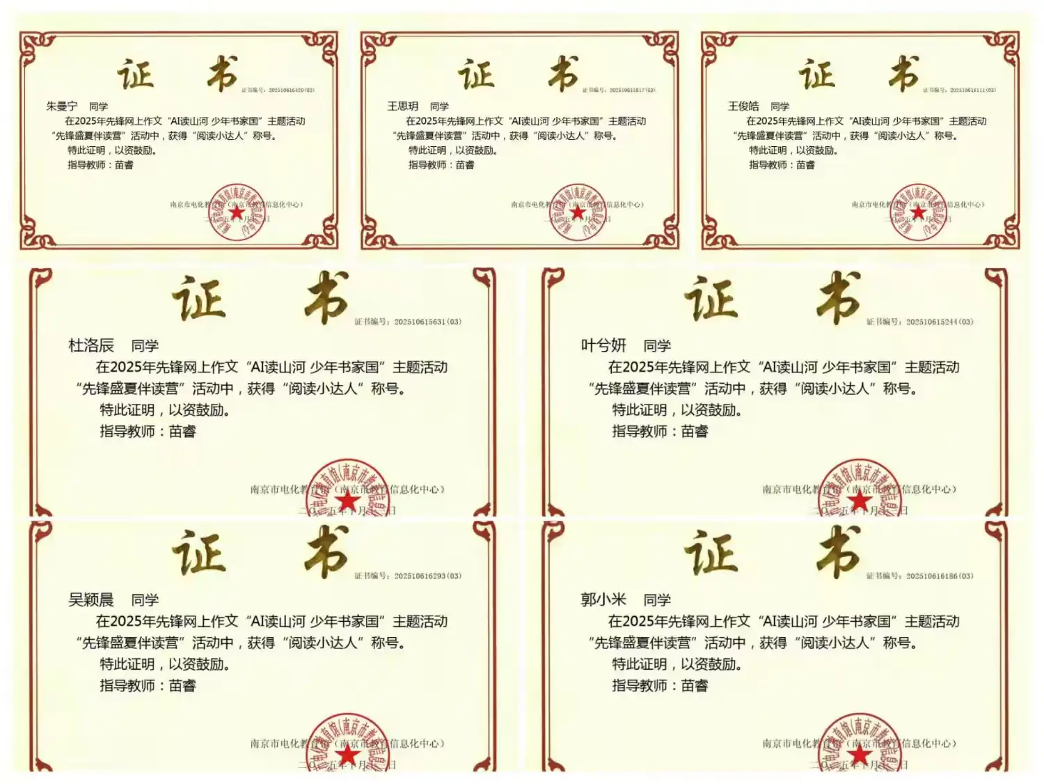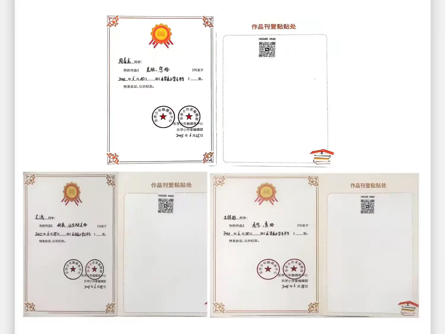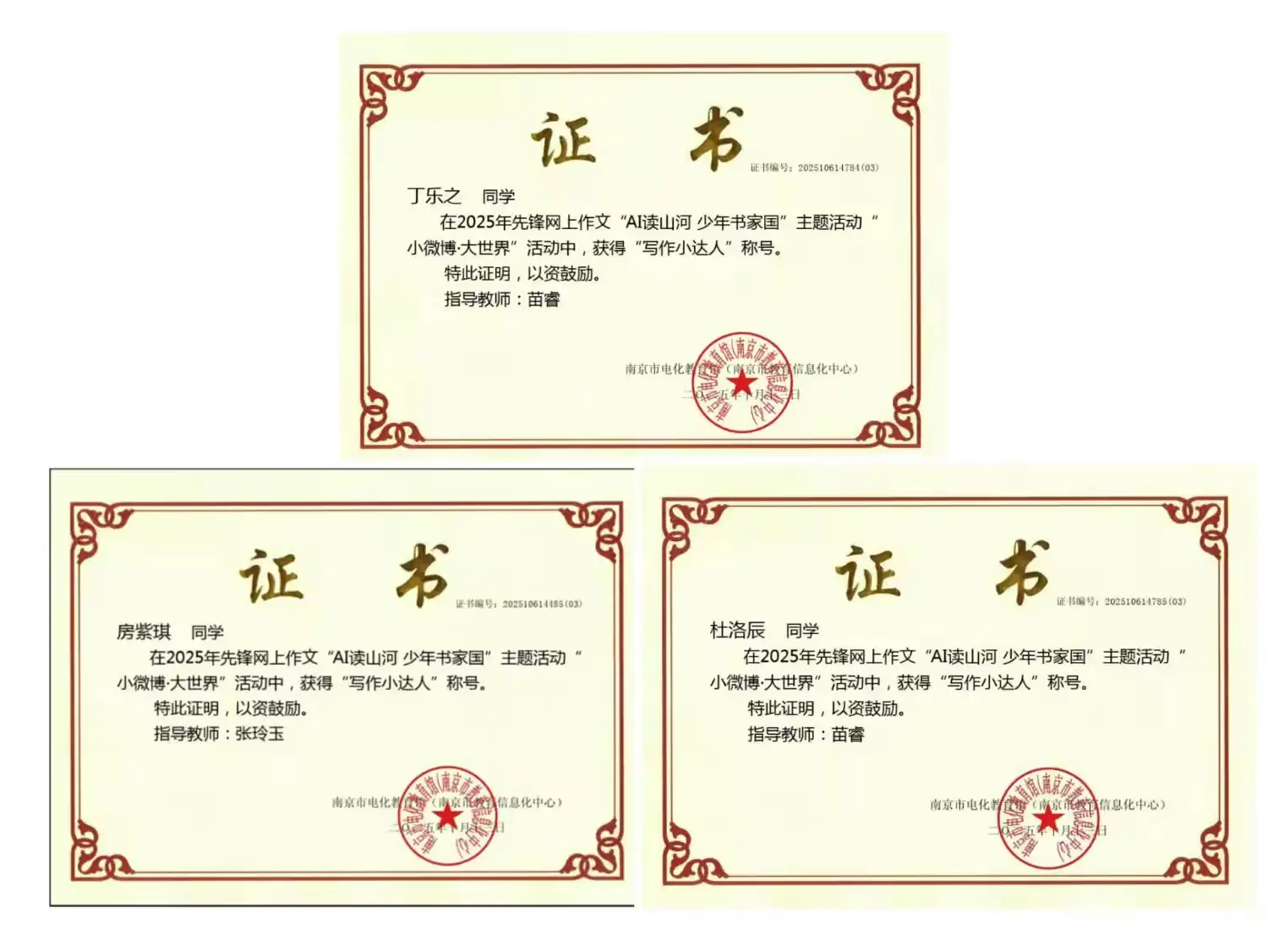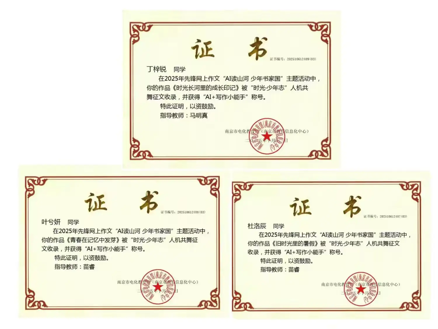 丁梓锐、叶兮妍、杜洛辰三位同学在2025“AI读山河 少年书家国”主题活动中,获“AI写作小能手”称号。
