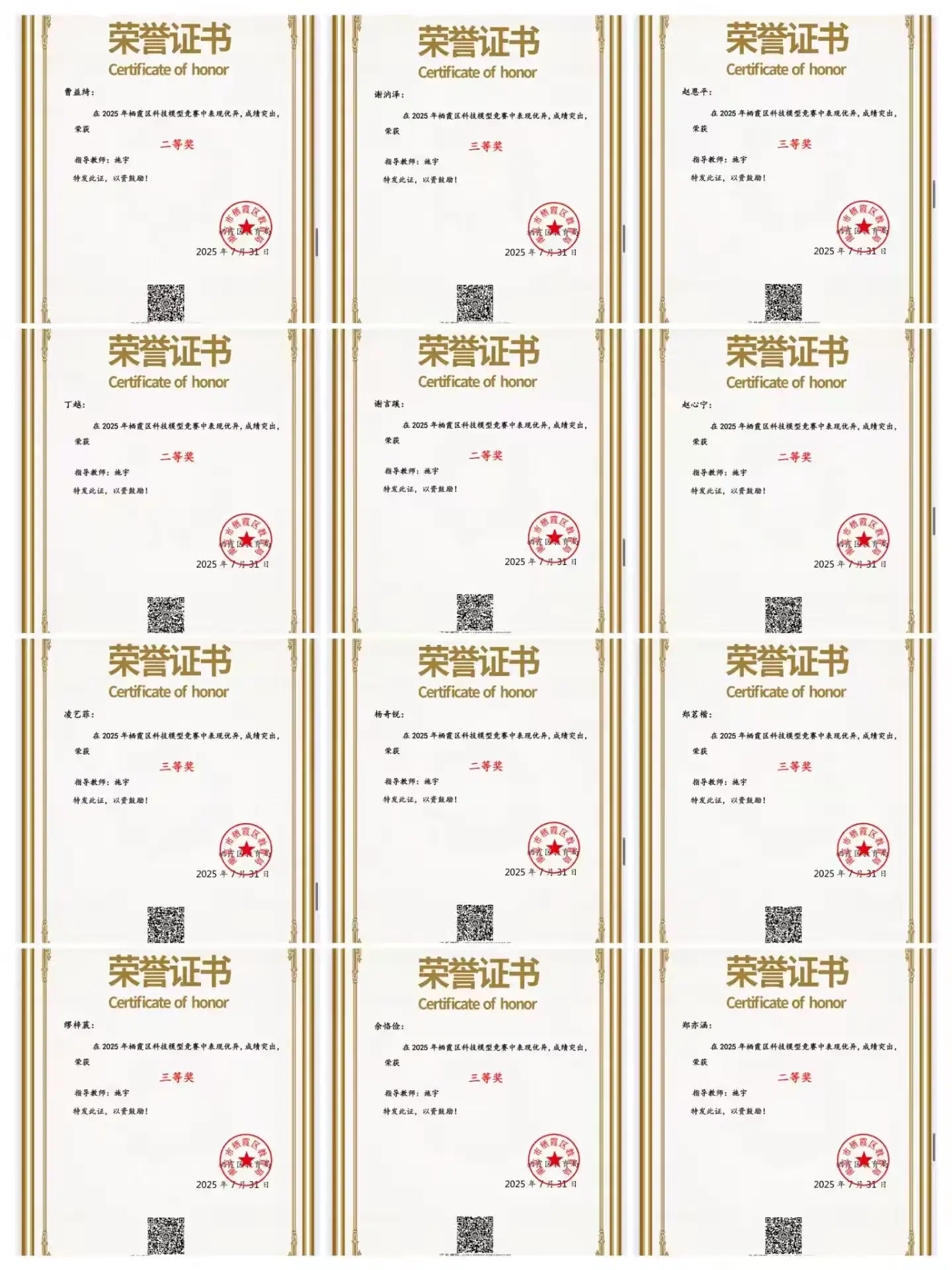 唐梓铭等十七名同学在2025年栖霞区科技模型竞赛中获奖。