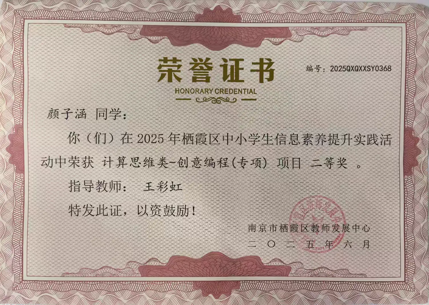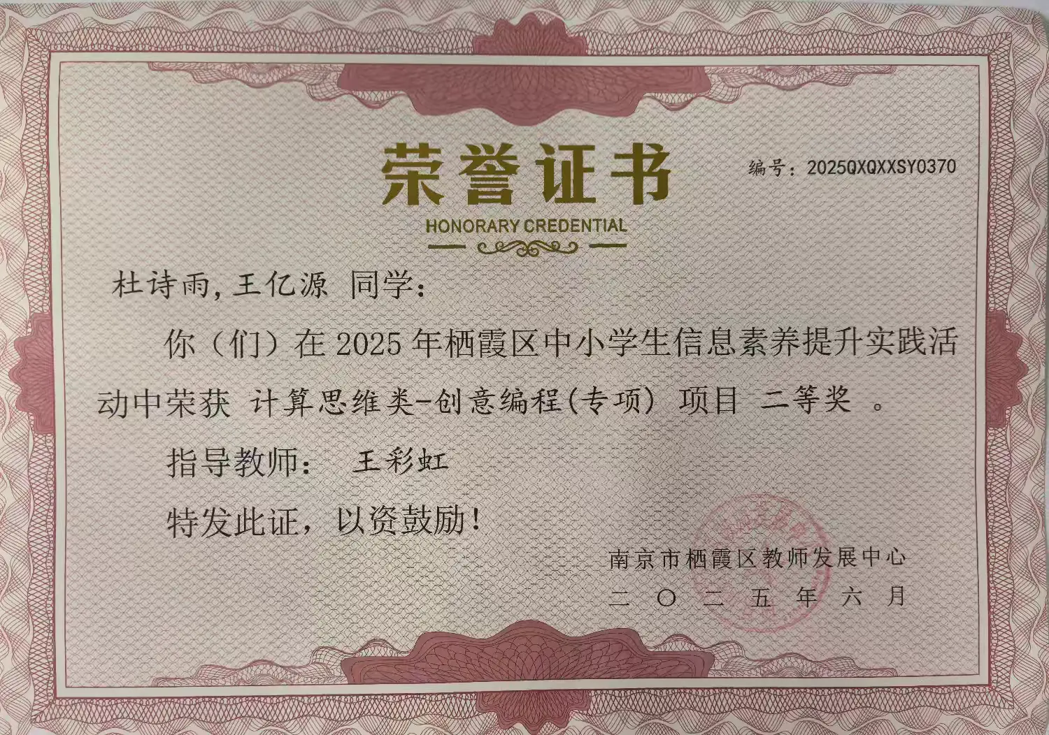 颜子涵、杜诗雨、王亿源三位学生在2025年栖霞区中小学生信息素养提升实践活动中荣获计算思维类-创意编程(专项)项目获二等奖。