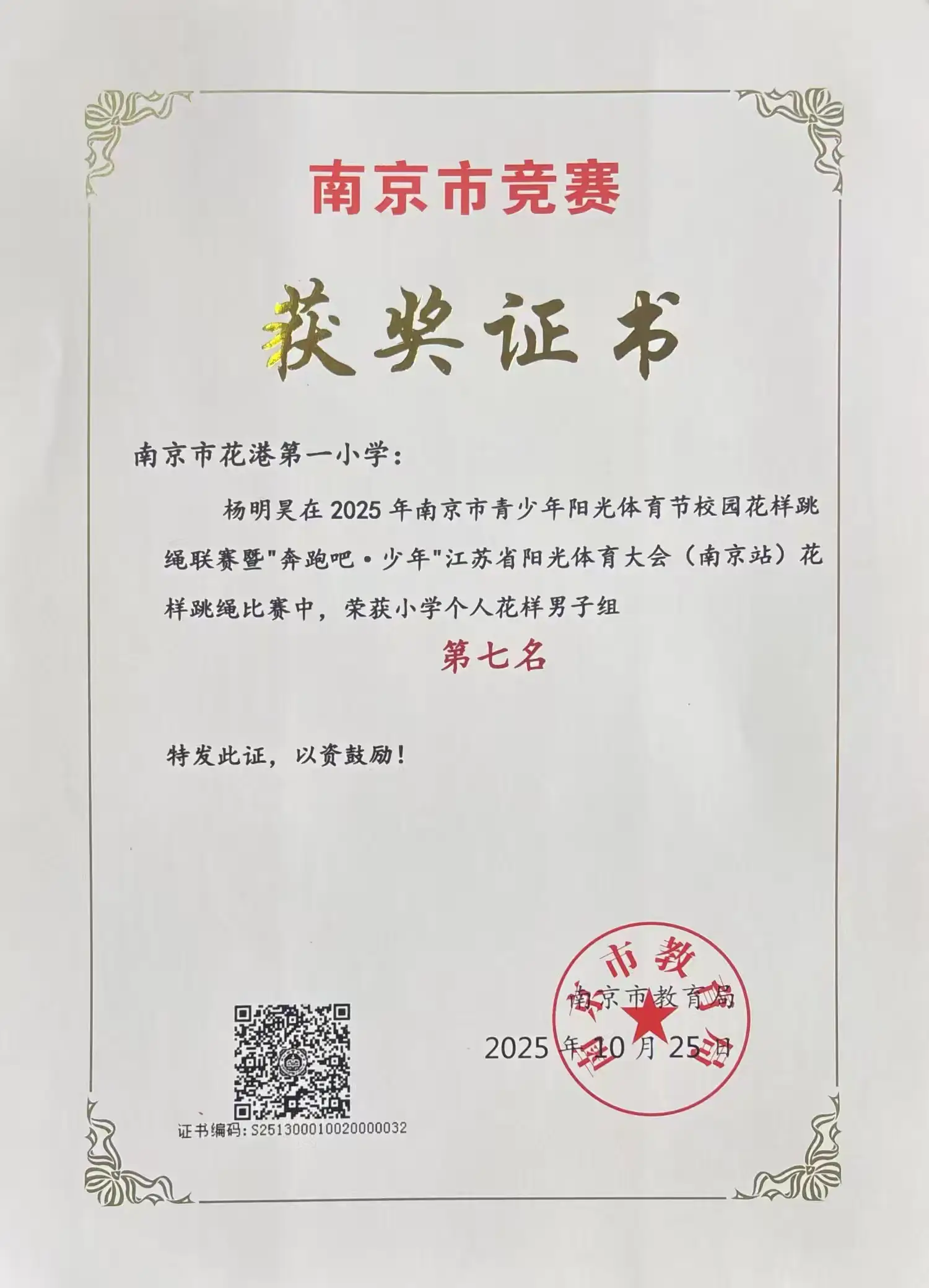 杨明昊同学在2025年南京市青少年阳光体育节校园花样跳绳联赛暨“奔跑吧·少年”江苏省阳光体育大会(南京站)花样跳绳比赛,小学个人花样男子组中获第七名。