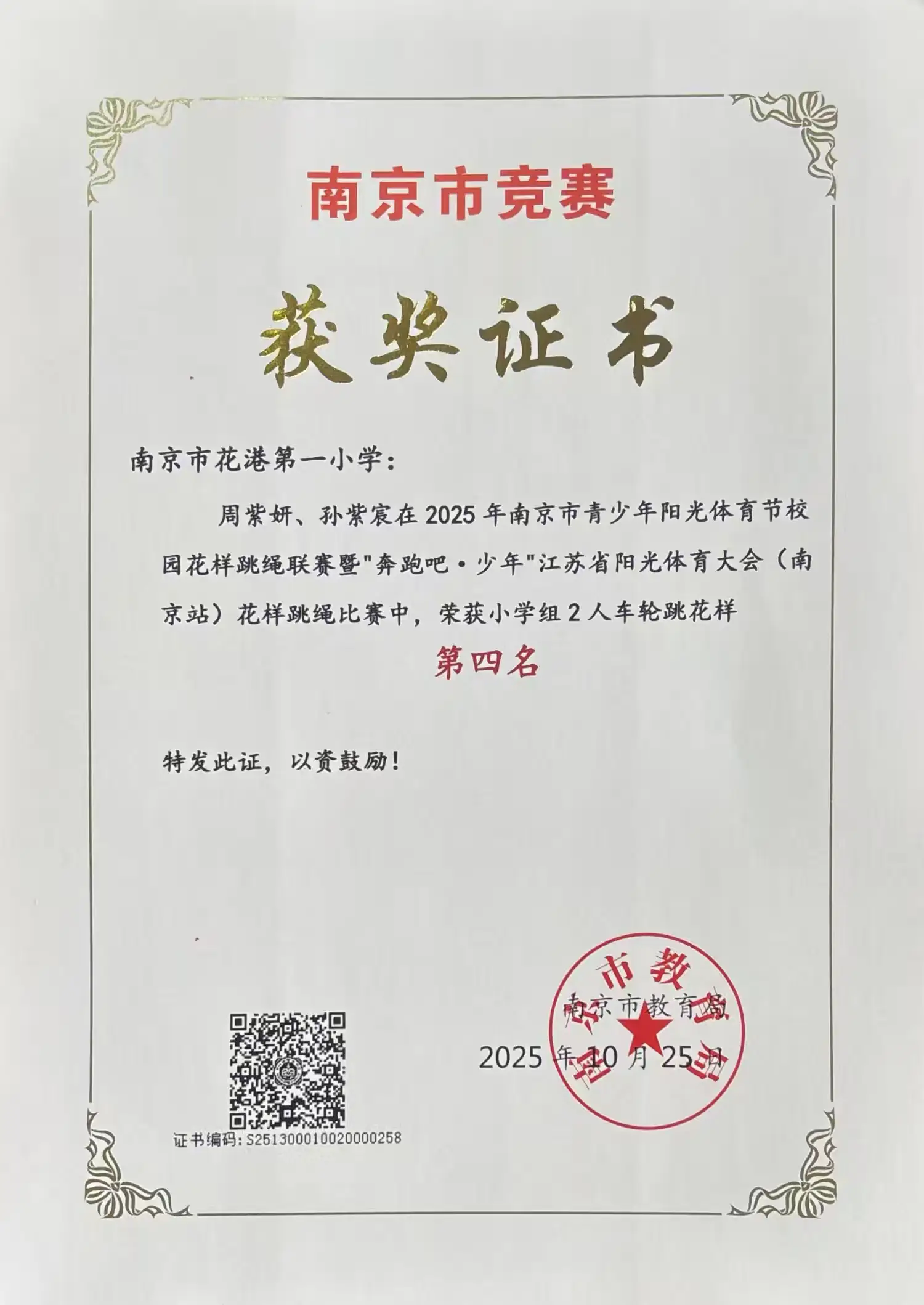 周紫妍、孙紫宸两名同学在2025年南京市青少年阳光体育节校园花样跳绳联赛暨“奔跑吧·少年”江苏省阳光体育大会(南京站)花样跳绳比赛,小学组2人车轮跳花样中获第四名。