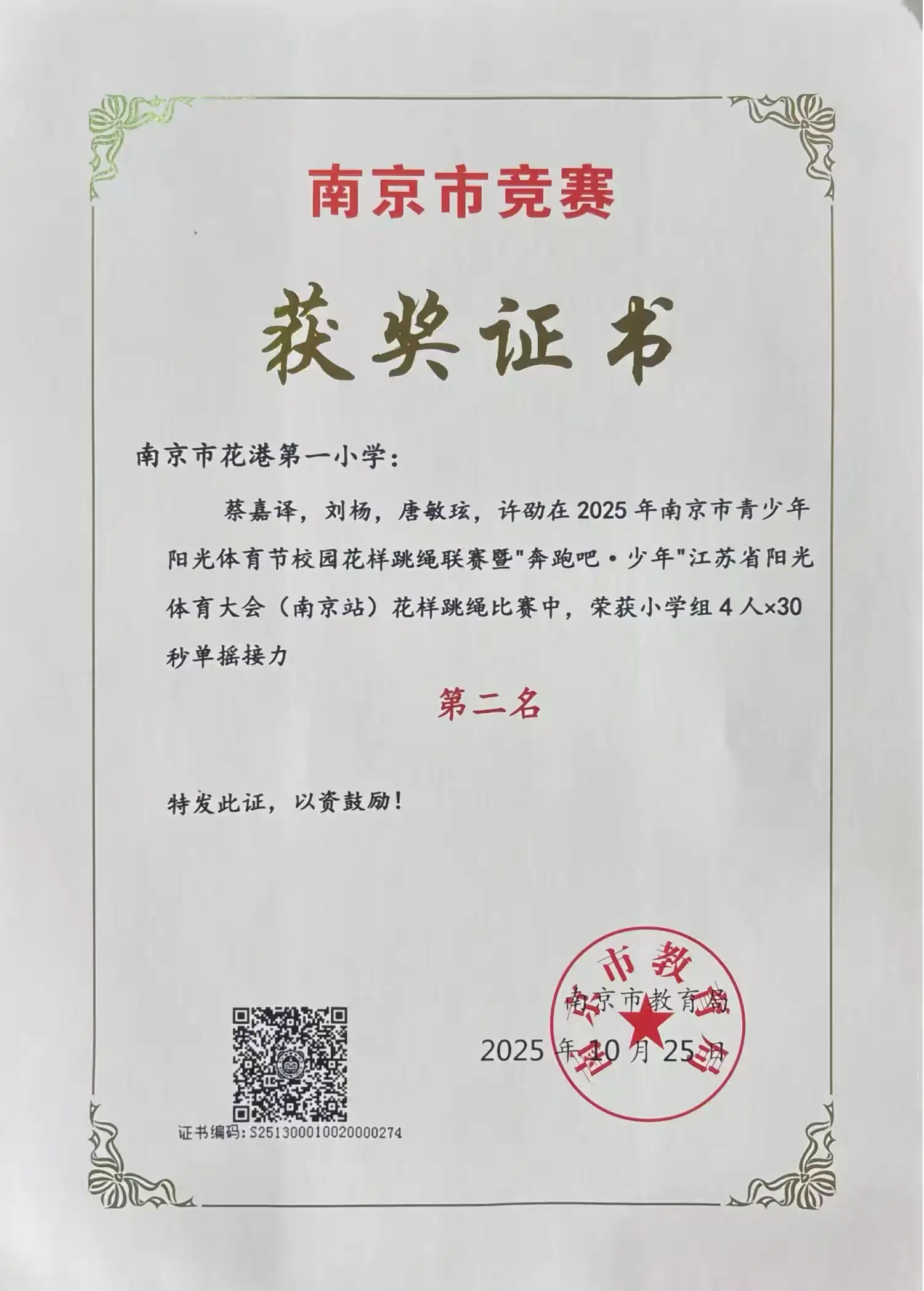 蔡嘉译、刘杨、唐敏玹、许劭四名同学在2025年南京市青少年阳光体育节校园花样跳绳联赛暨“奔跑吧·少年”江苏省阳光体育大会(南京站)花样跳绳比赛,小学组4人×30秒单摇接力中获第二名。