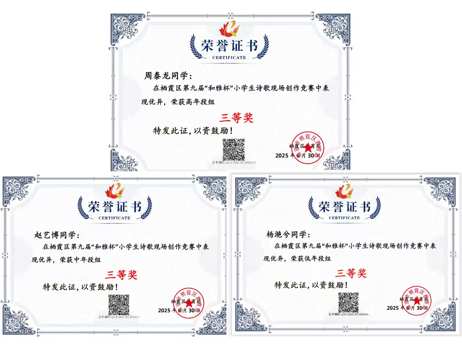 赵艺博、杨滟兮、周泰龙三位学生在栖霞区第九届“和雅杯”小学生诗歌现场创作竞赛低年段组获(三等)奖。