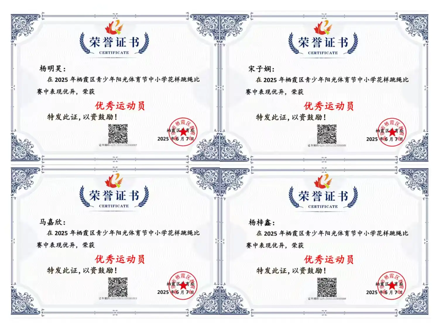 马嘉欣、宋子娴、杨明昊、杨梓鑫四位学生在2025年栖霞区青少年阳光体育节中小学花样跳绳比赛中荣获优秀运动员。