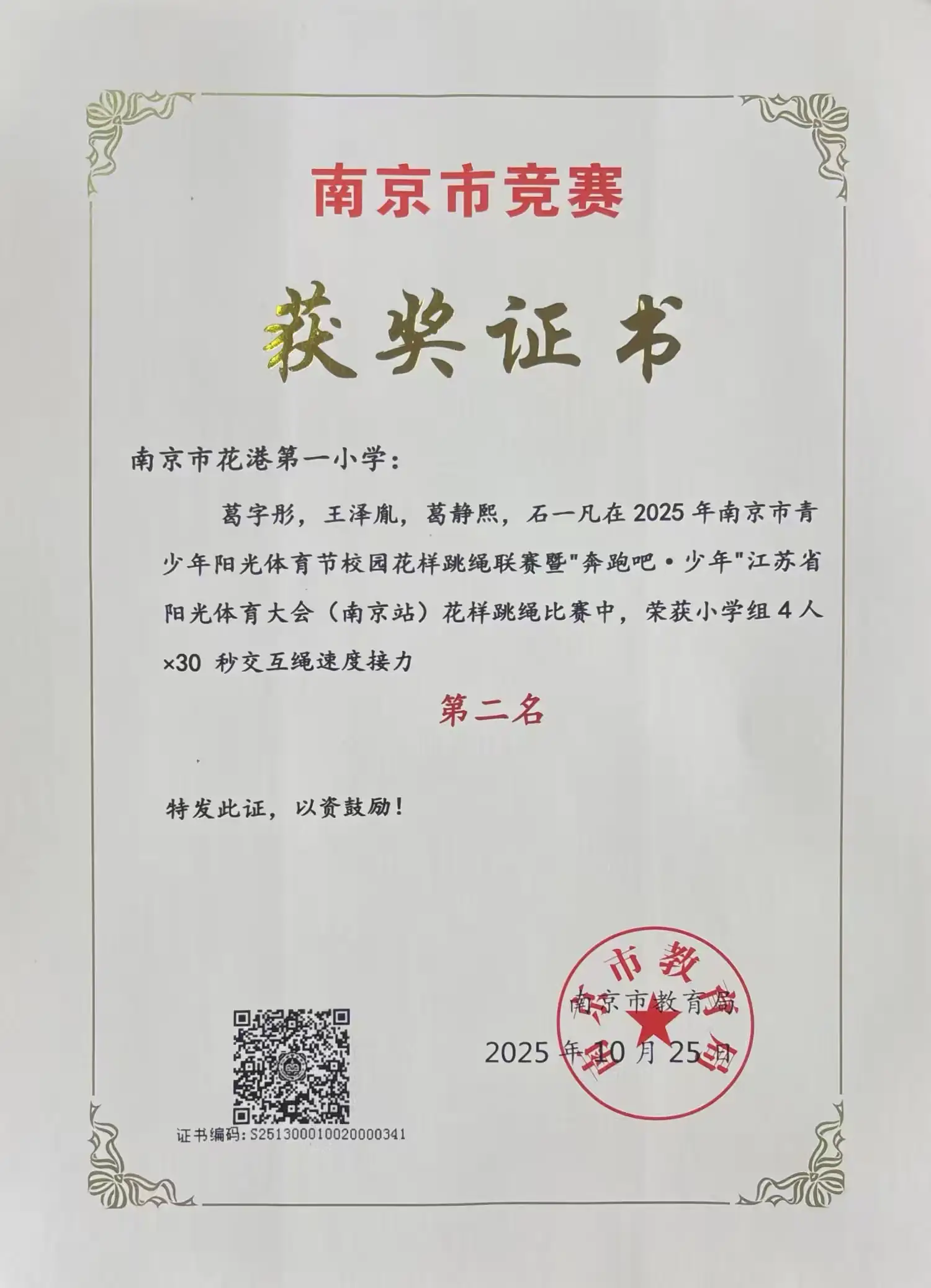 葛字彤、王泽胤、葛静熙、石一凡四名同学在2025年南京市青少年阳光体育节校园花样跳绳联赛暨“奔跑吧·少年”江苏省阳光体育大会(南京站)花样跳绳比赛,小学组4人×30秒交互绳速度接力中获第二名。