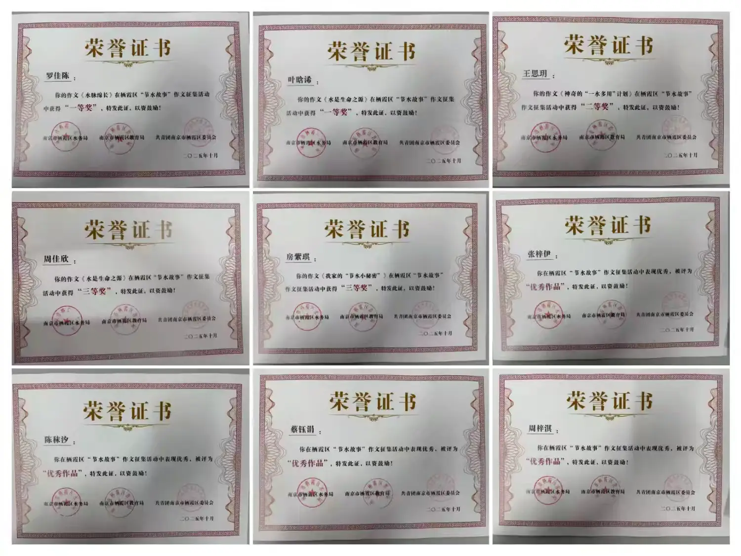 徐昕、殷钰老师在栖霞区“节水故事”作文征集活动中荣获优秀指导教师称号。