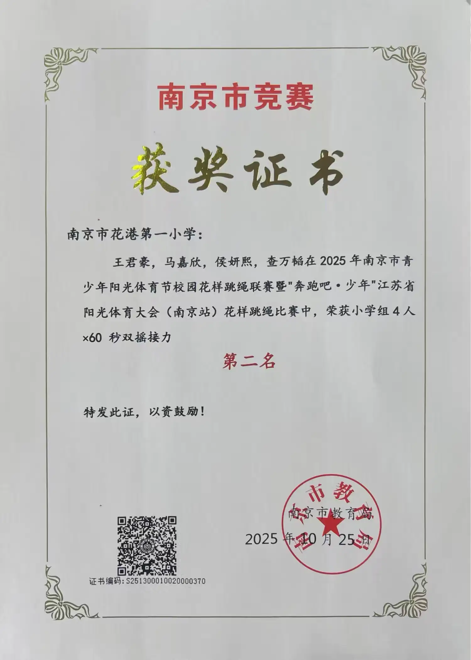 王君豪、马嘉欣、侯妍熙、查万韬四名同学在2025年南京市青少年阳光体育节校园花样跳绳联赛暨“奔跑吧·少年”江苏省阳光体育大会(南京站)花样跳绳比赛,小学组4人×60秒单摇接力中获第二名。