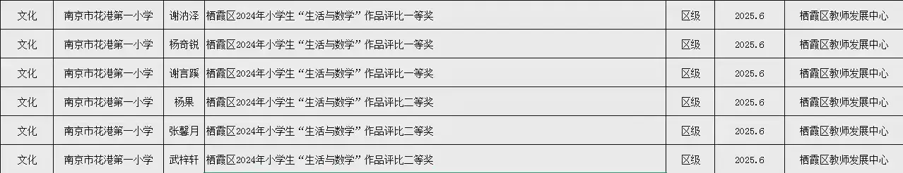 谢汭泽等六位学生在栖霞区2024年小学生“生活与数学”作品评比中获(一、二等)奖。