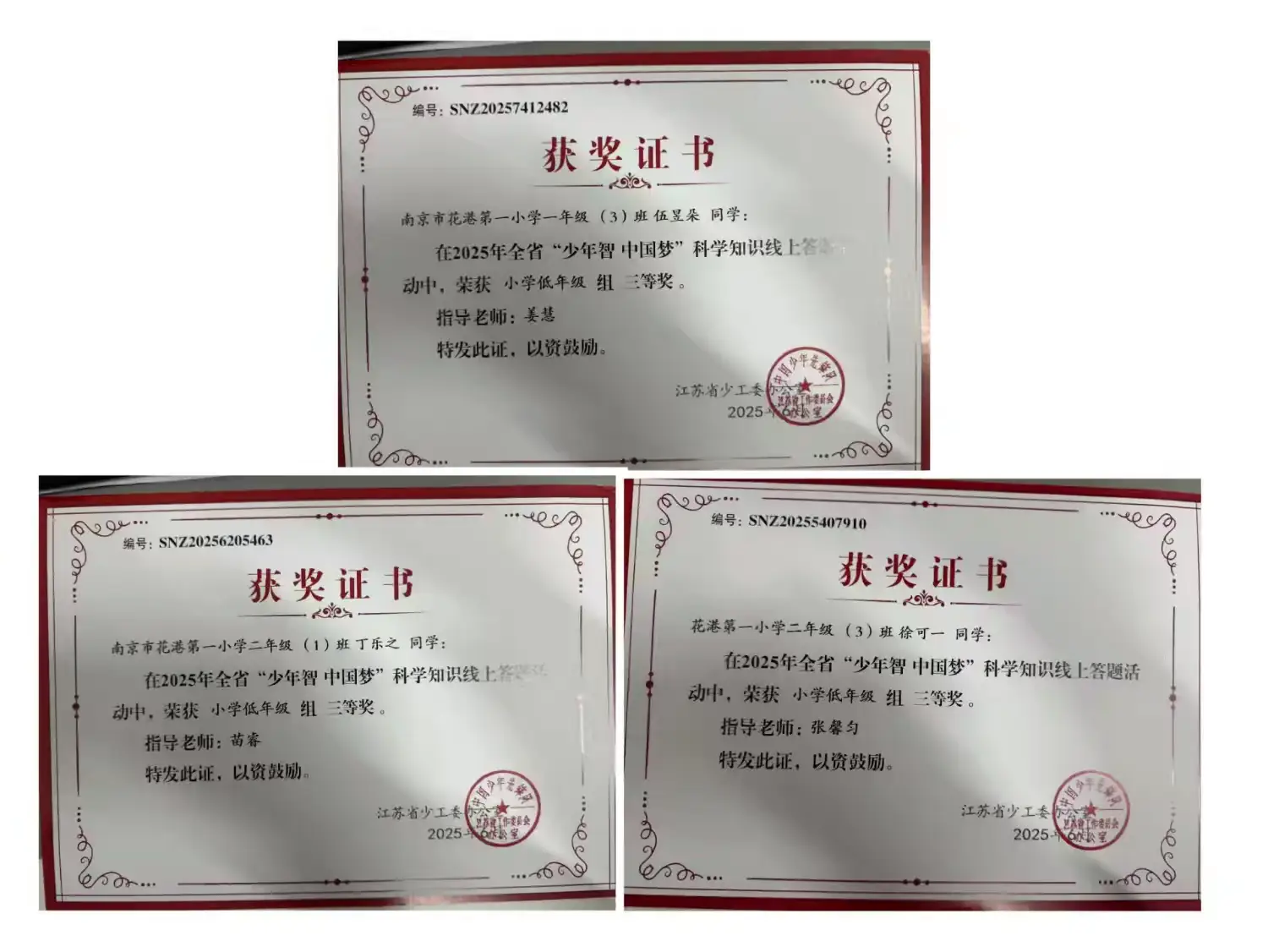 丁乐之、伍昱朵、徐可一三位学生在2025全省“少年智中国梦”科学知识线上答题活动获三等奖。